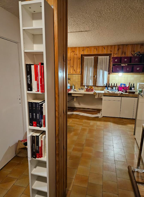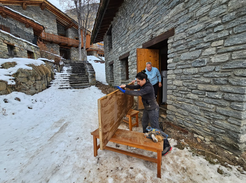 Petit-déjeuner, puis chacun choisit son programme : ski de rando, snowboard, balade dans le village… Pendant ce temps, une équipe de travaux démonte les marches de l’escalier, ponce les planches et prépare la salle de bain pour la peinture. Patrick décâble les anciens capteurs incendies pour les emmener à la déchetterie pour décontamination.