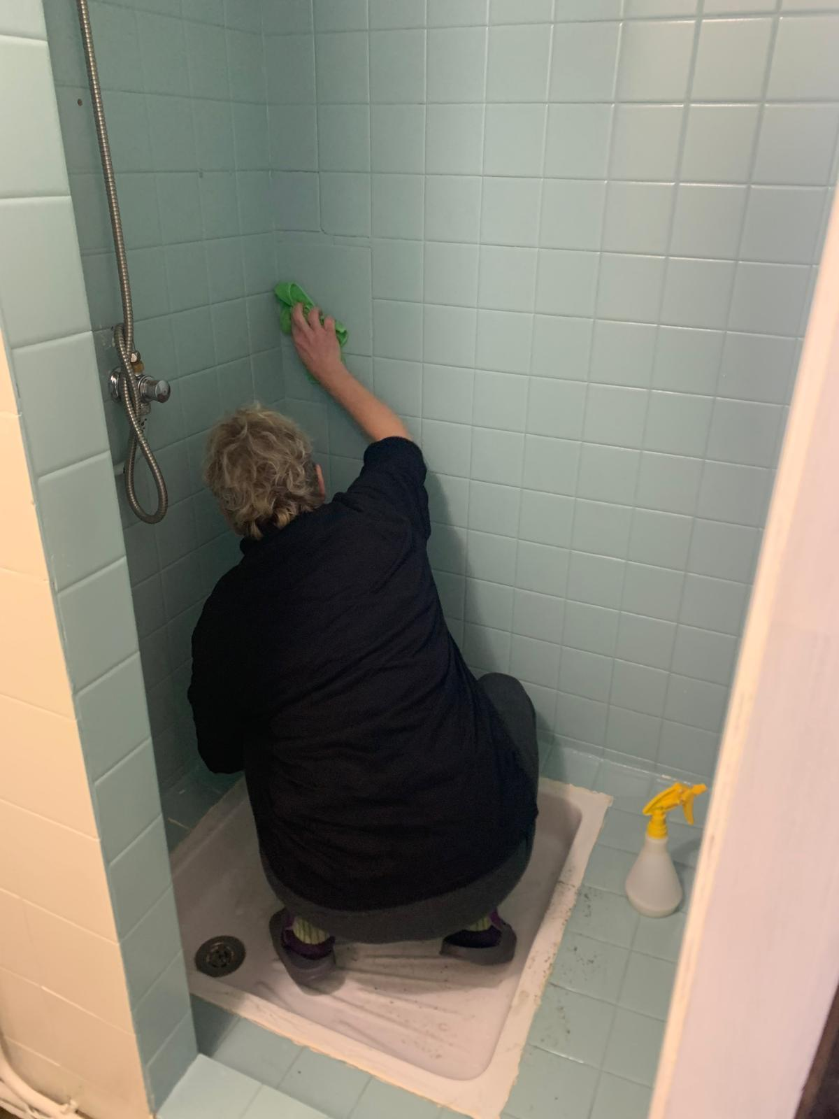 Nathalie dégraisse la cabine de douche pour la 2ème couche de bleu sur carrelage