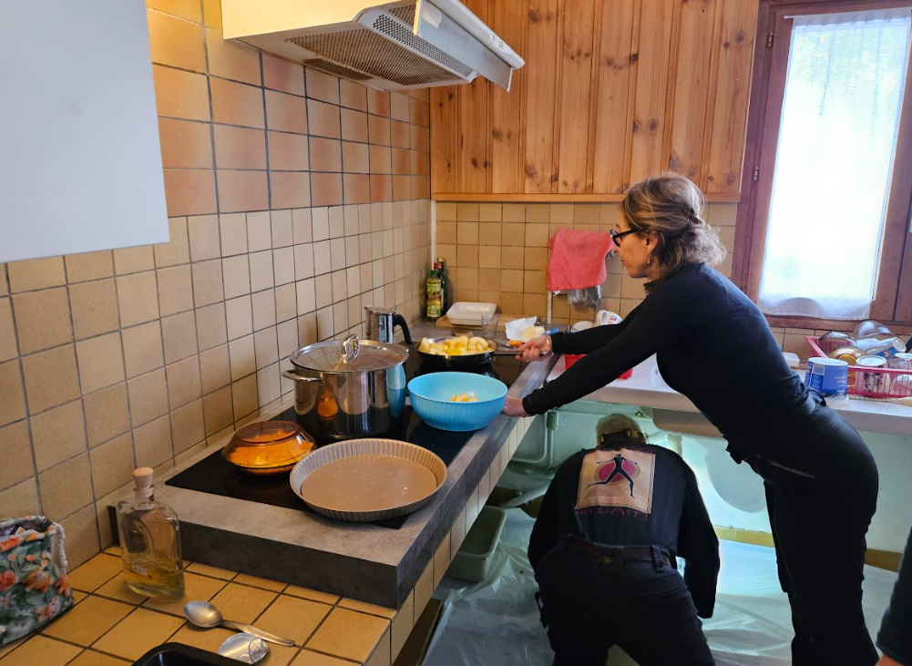 Sur place, la première équipe commence le nettoyage du chalet et installe la draperie toute propre. Alexia rejoint Patrick pour travailler sur le chauffage au sol et au plafond. La deuxième équipe arrive en soirée, accueillie par un Mont d’Or et une raclette bien méritée.