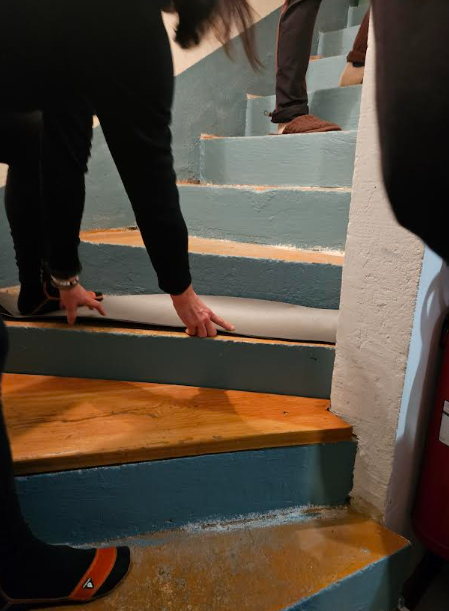 Delphine et Thibault font la découpe des mousses et reposent les marches.