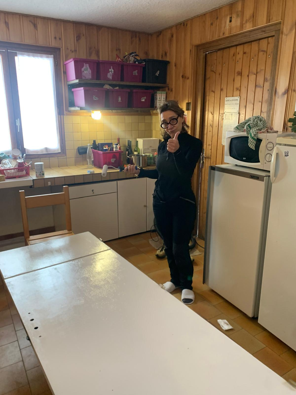 Alexia fait les vitres et nettoie le cadre des fenêtres de tout le chalet, on voit à présent la bonne ambiance à l’intérieur !