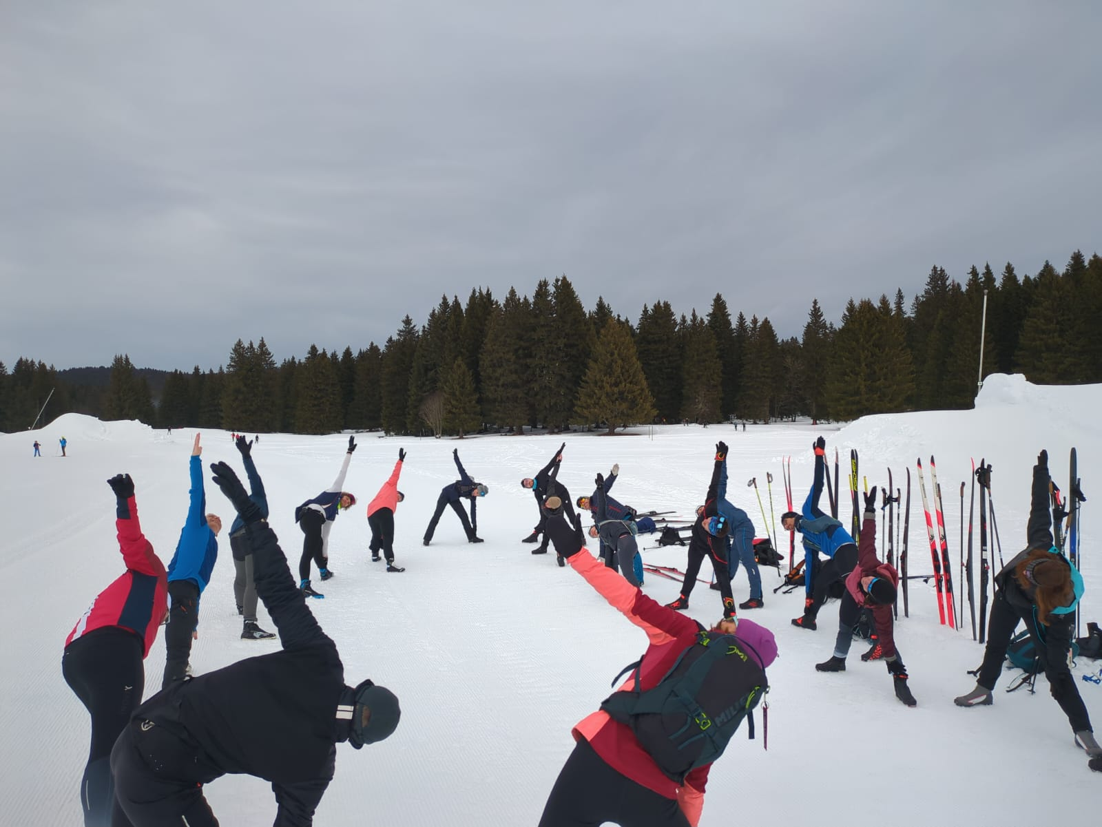 DĂšs l'arrivĂ©e au plateau de GĂšve, aprĂšs le passage rituel Ă la location de skis et la montĂ©e en navette, nous avons dĂ©butĂ© la journĂ©e par un moment de cohĂ©sion original : une sĂ©ance dâĂ©chauffement/yoga (la souplesse Ă©tait au rendez-vous !). Rien de tel pour rĂ©veiller les corps avant d'attaquer les premiĂšres boucles.