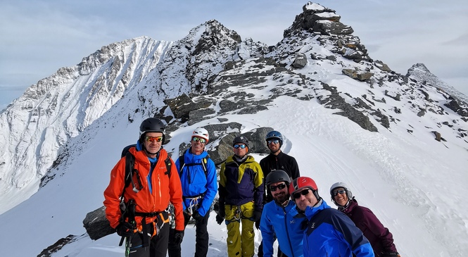 On esquive les rochers pour atteindre le glacier de Labby. On s’encorde sur le replat et c’est parti pour les conversions au milieu de la corde. Les conditions de neige se dégradant on chausse les crampons pour rejoindre le col où la vue est dégagée et vertigineuse.