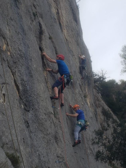 La vue est belle et l'équipe se met très vite à l'assaut du secteur. Un peu de chauffe puis viennent les 6b, 6c et même 7a pour certain.es, merci à notre invitée du cycle Baston d'avoir remonté le niveau.