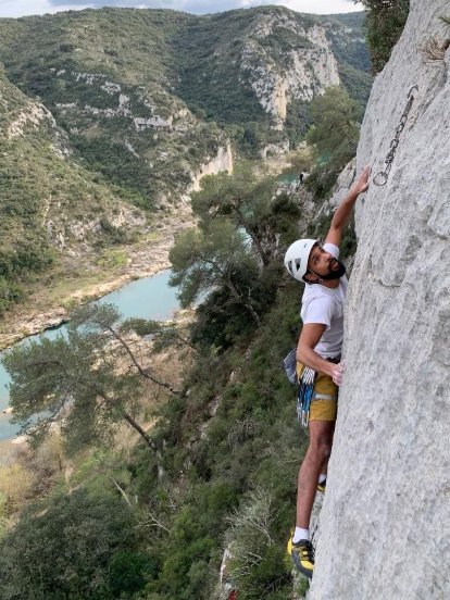 Nous nous retrouvons enfin à Collias où nous remontons les berges du Gardon, jusqu'au pied de belles falaises. Après une approche assez incertaine, Cédric nous mène via une main courante jusqu'au pied des voies.