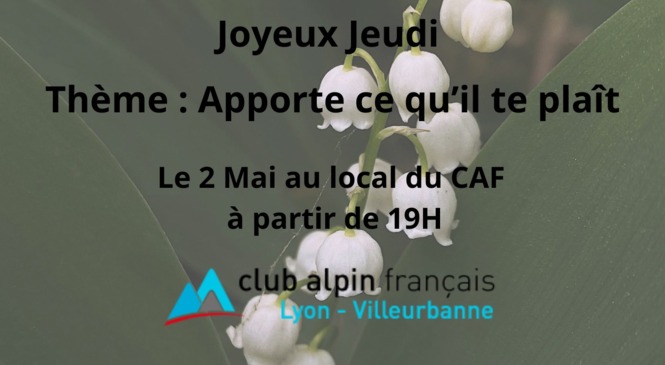 JOYEUX JEUDI DE MAI Vie du club Rédigé par ChristelK-b03 le 03/05/2024 Publié par JeanchristophS-e62 le 29/04/2024 0 commentaire En ce JOYEUX JEUDI de MAI Chacun apportera un mets ou une boisson qui lui plaît ! et cela sera encore une fois un plaisir de tous se retrouver et d'échanger...