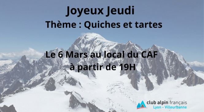JOYEUX JEUDI DE MARS Vie du club Rédigé par ChristelK-b03 le 26/02/2025 Publié par ChristelK-b03 le 26/02/2025 1 commentaire RENDEZ-VOUS AU LOCAL DU CLUB JEUDI 6 MARS A PARTIR DE 19 HEURES JOYEUX JEUDI THEME PROPOSE : QUICHES ET TARTES A BIENTÔT