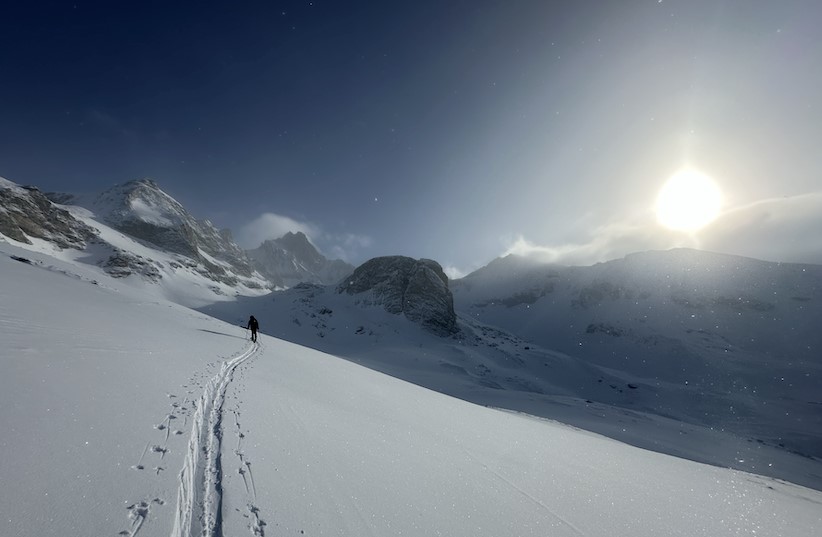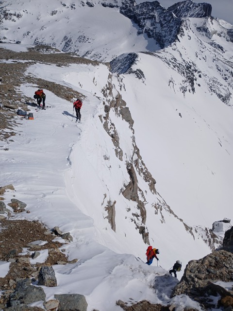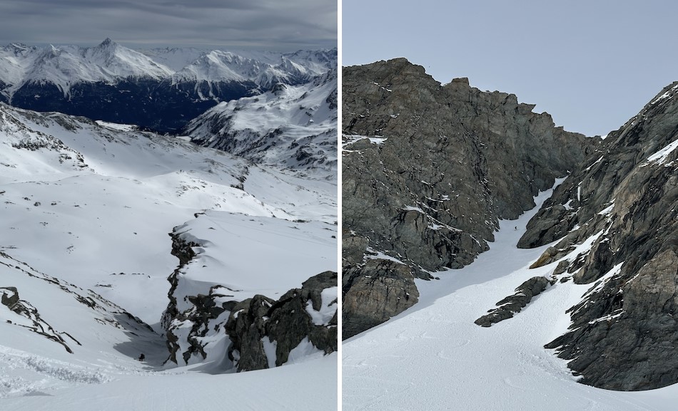 Sur le chemin nous bifurquons pour remonter le fameux couloir en « Y » qui ressemble en fait plus à un « T » mais le thé c’est pour les anglais donc on va rester sur notre lettre grecque. La haut on peut profiter d’une vue imprenable sur le massif de la Vanoise. Puis au moment de se jeter dans le couloir, certains se demandent tout de même si la pente d'attaque, creusée par le vent, est bien réglementaire ??!!