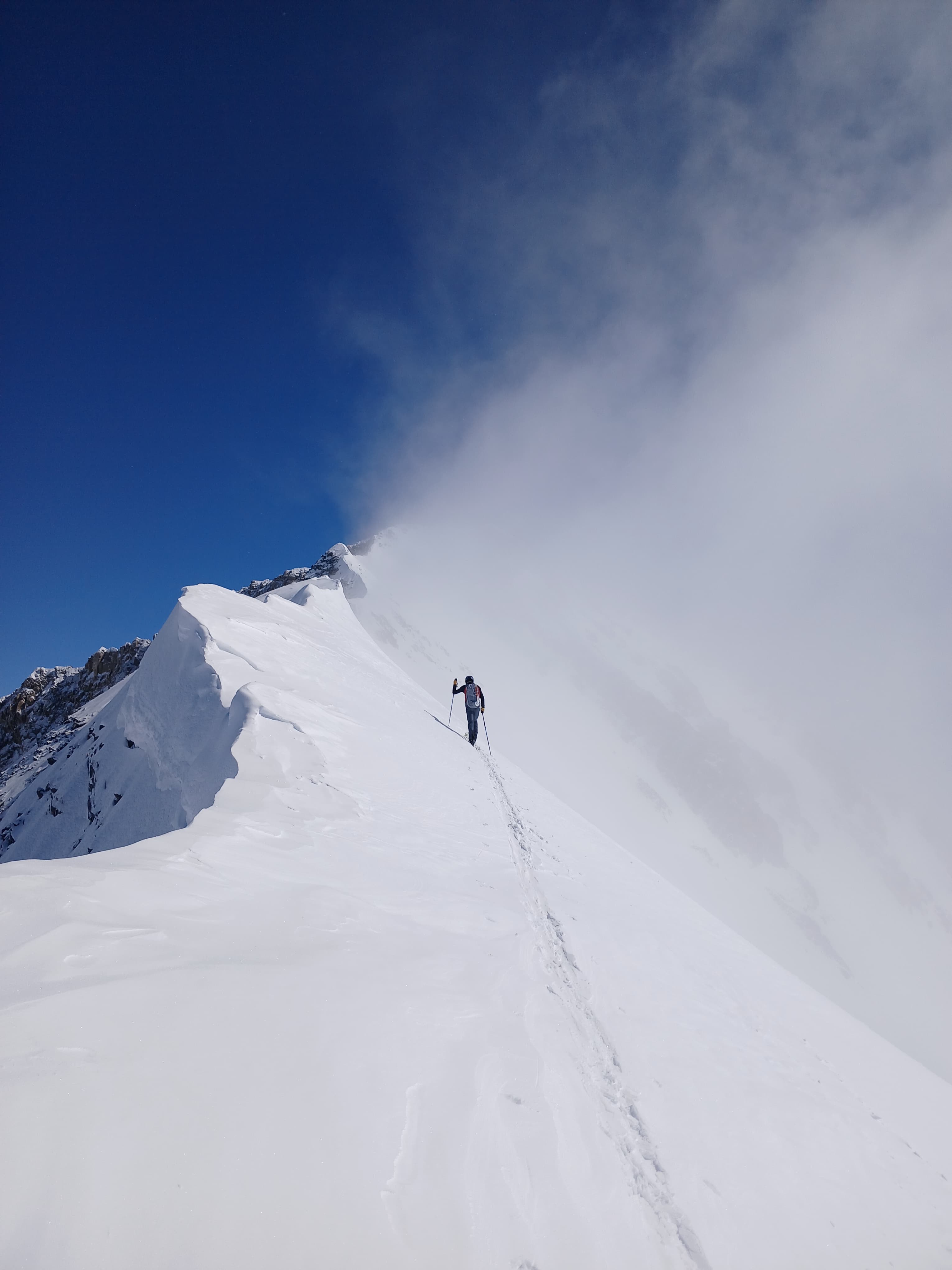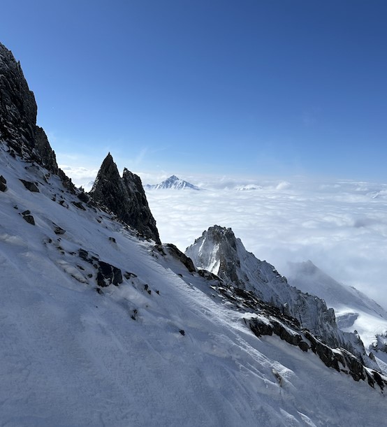 On termine par une arête sommitale où chacun y va de son style, couteaux pour certains, crampons pour d’autres. Et puis, boum, on atteint le sommet à 3695m où l’on peut se délecter d’une vue à 360 degrés sur le massif des Alpes. Le panorama est sublimé par cette mer de nuage qui ne laisse
