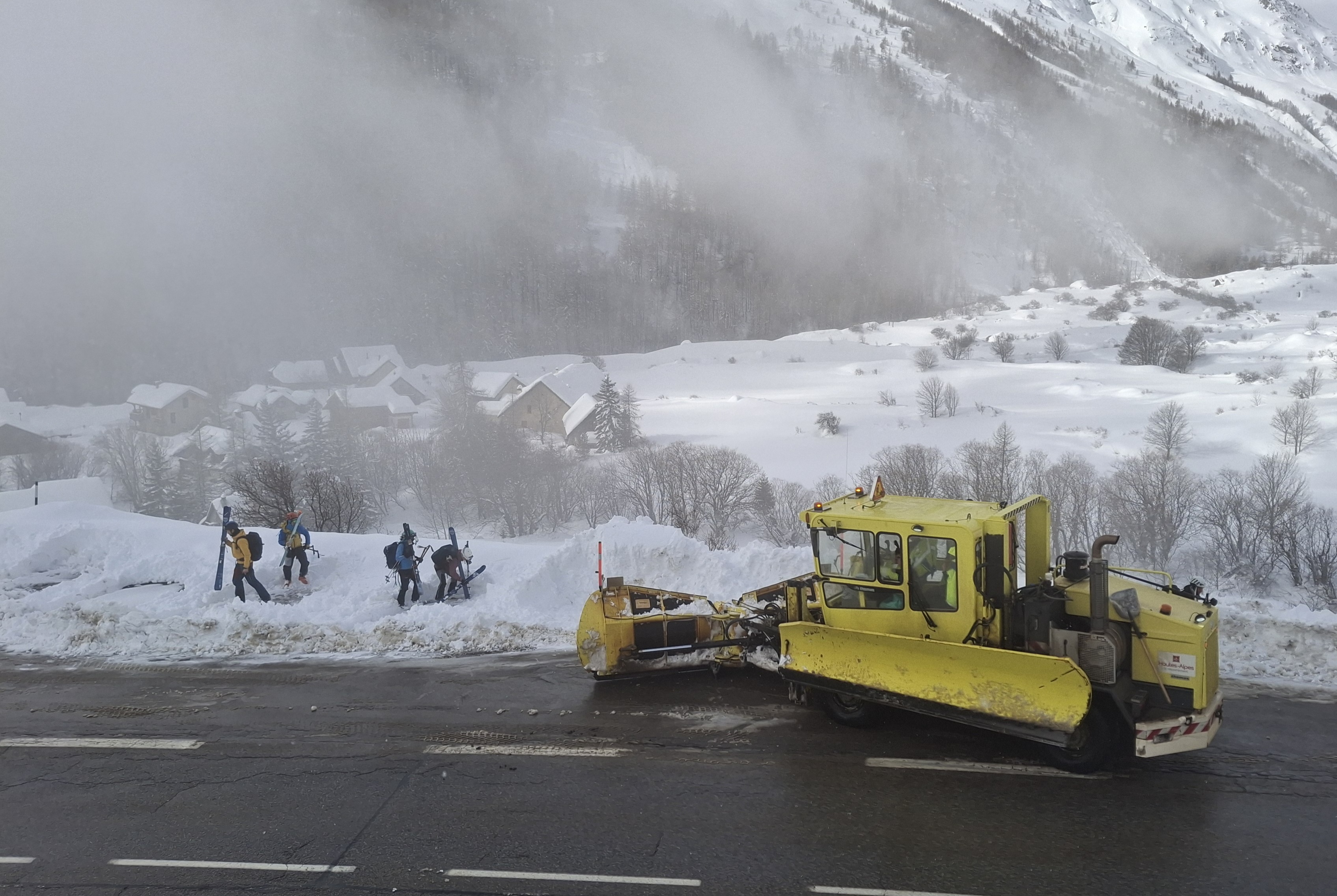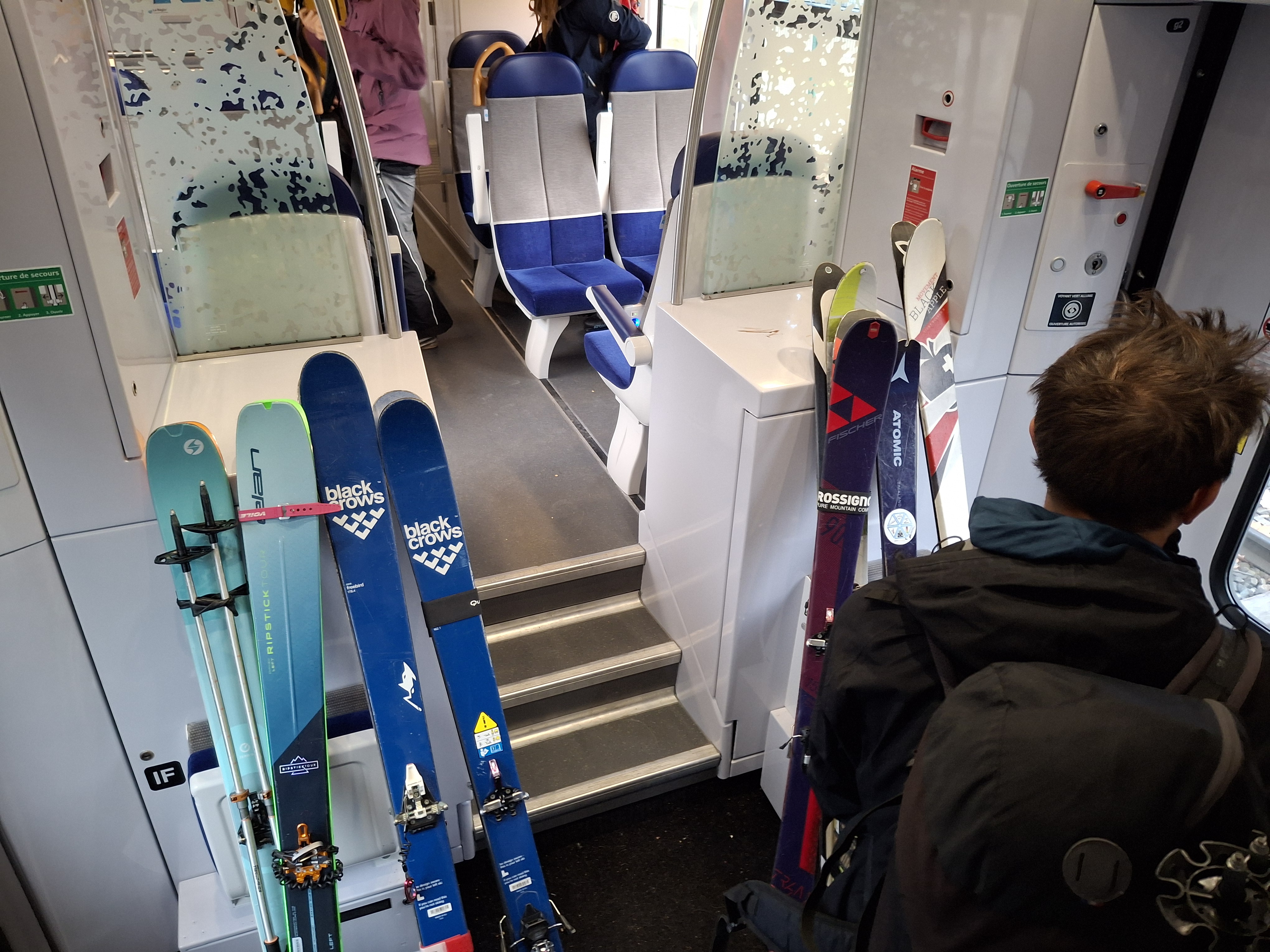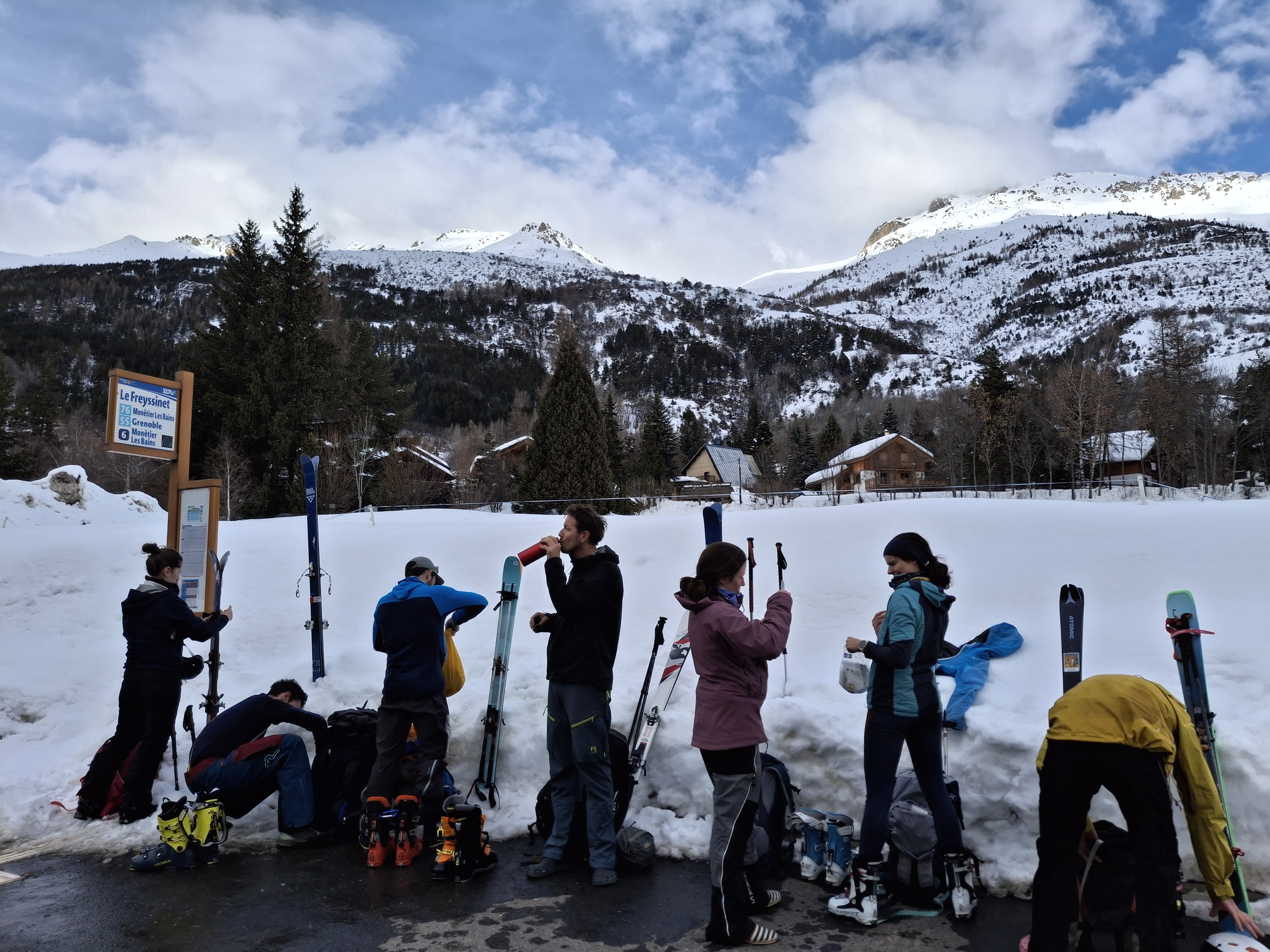 🚆Mercredi, c’est donc parti pour 5 jours de raid dans les Cerces avec beaucoup d’incertitudes. Finalement, l’accès en mobilité douce en montagne s’avère être le plus simple et le plus prévisible. Notre train grenoblois nous accueille à bras ouverts. Même en semaine à 8h, il y a plein de places pour nous et nos planches. Une Lagopède accoutumée arrive d’un pas nonchalant 2 minutes avant le départ du train, sereine. A Grenoble, nous montons dans le bus qui emprunte la route directe après la réouverture du col du Lautaret (fermé la nuit à cause des chutes de neige). Nous sommes plutôt contents de ne pas visiter la Maurienne et l’Italie cette fois-ci. Le bus bascule côté est du col et nous dépose au Lauzet. Les nuages sont accrochés aux sommets, la visibilité paraît correcte. Les Lagopèdes se métamorphosent de piétons à skieurs : les espadrilles, crocs et tongues sont rangées dans le sac, les peaux sont collées sur les skis (après un raclage du ski de dernière minute pour enlever le surplus de fart de Lagopèdes zélés).