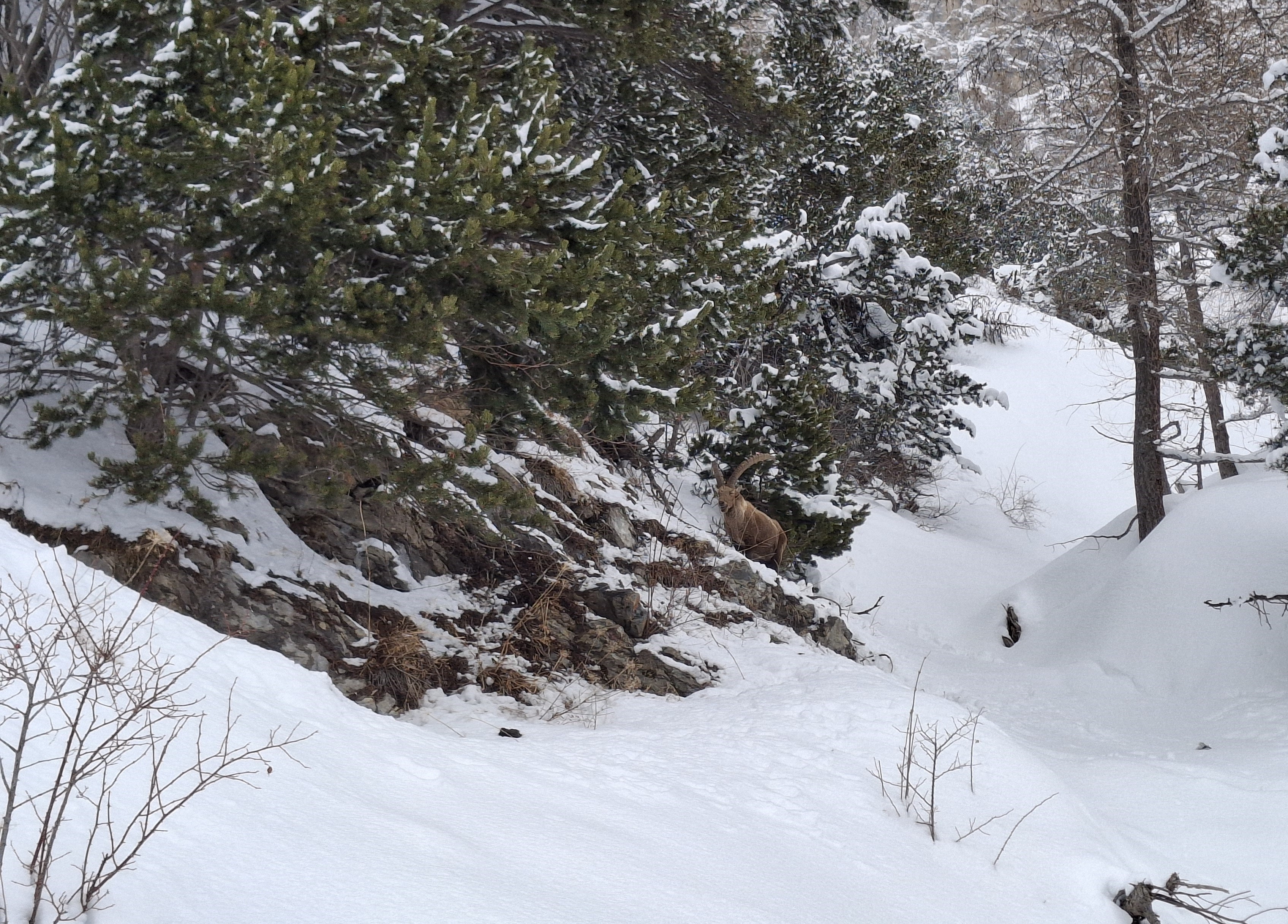 🐐La première difficulté technique est de franchir le mur de neige le long de la route, créé par le chasse-neige. Notre co-encadrant taille de belles marches pour le passage de tous…. Qui seront détruites juste après notre passage par le chasse-neige efficace, pour ne pas dire expéditif. Il aurait pu provoquer l’extinction de l’espèce en un seul coup de lame ! L’itinéraire pour monter au refuge est étudié finement par le groupe. Objectif : identifier les quelques passages qui pourraient être exposés et mettre les distances adéquates. En plein milieu d’un potentiel couloir d’avalanche, un bouquetin placide et serein nous observe passer. Tout le monde n’a pas le même état d’esprit face aux risques. Plus loin sur l’itinéraire, une dizaine de bouquetins mange tranquillement ce qui doit être comestible sous la neige. Ils sont perchés en pleine pente de neige et au milieu des falaises, là où on ne penserait pas pouvoir tenir debout. Le refuge est atteint après la traversée du ruisseau à tâtons dans la neige fraîche, avec un effet « jour blanc ». Le refuge du Clot des Vaches, tout neuf et bien spacieux, est bien accueillant.