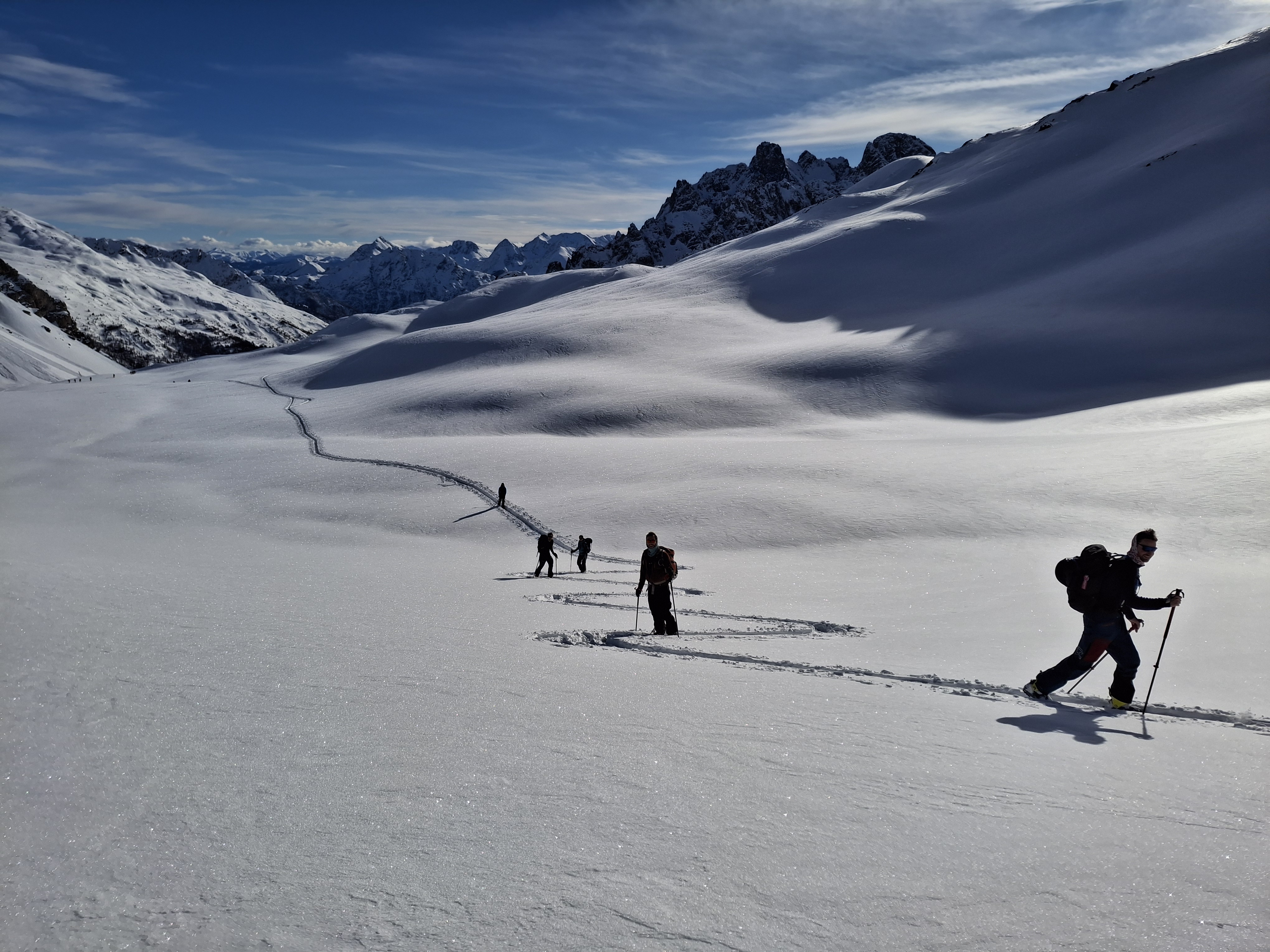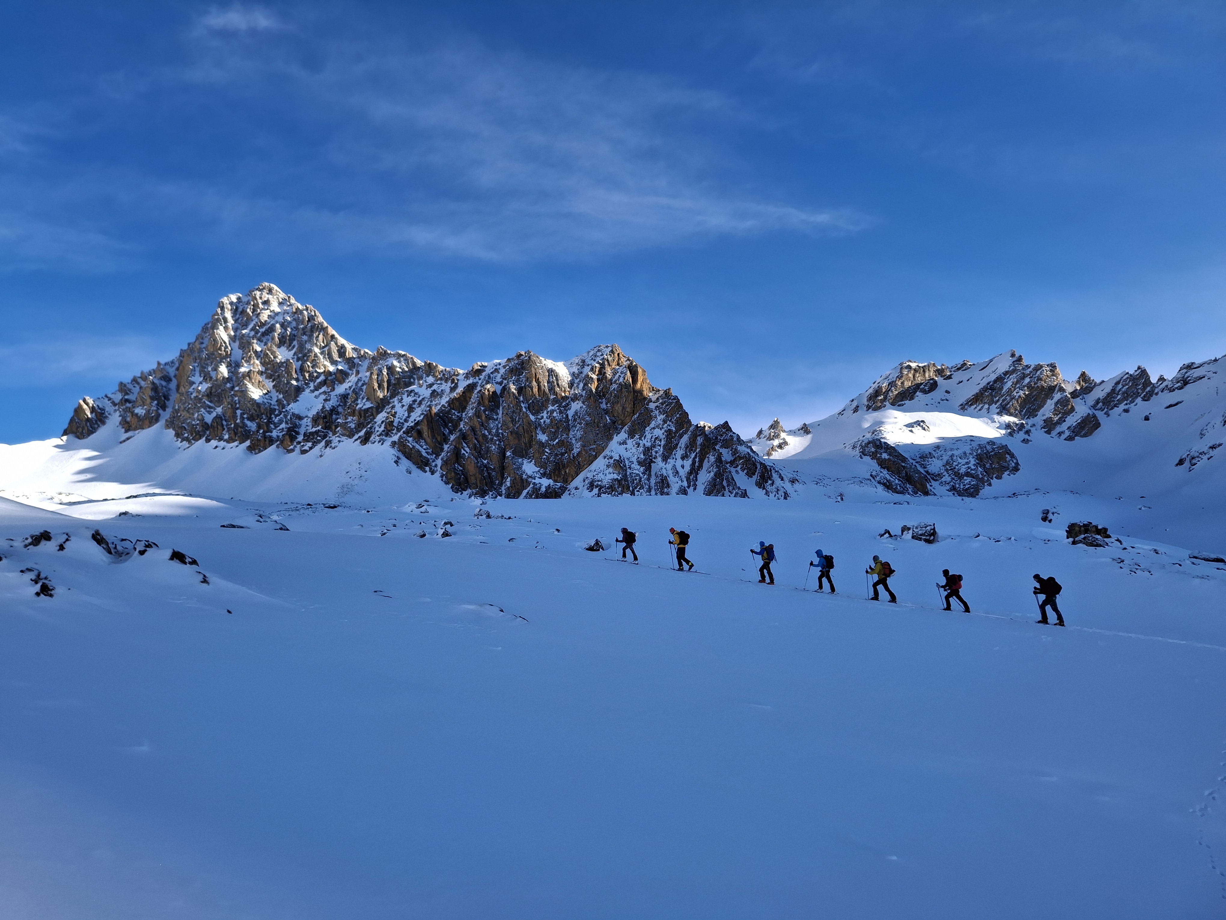 🎨Le samedi, le beau temps revient. Nous pouvons explorer le vallon jusqu'au col du Chardonnet dans une ambiance féérique. Le plaisir unique et magique de faire sa trace et d'ouvrir un pan entier de montagne non fréquenté depuis plusieurs jours. La neige est damée pas à pas, les lignes, les S, les zig-zags sont dessinés au gré de l'envie de l'artiste Lagopède. Les relais sont pris jusqu'au col. Derrière nous, au loin, deux autres groupes avec guide rentabilisent notre effort collectif en suivant notre trace. La première descente offre une poudre douce et rebondissante. Arrivés en bas de la pente, on n’a qu’une envie, c’est repartir. C'est quand même l'heure de la pause pique-nique en bord de lac.