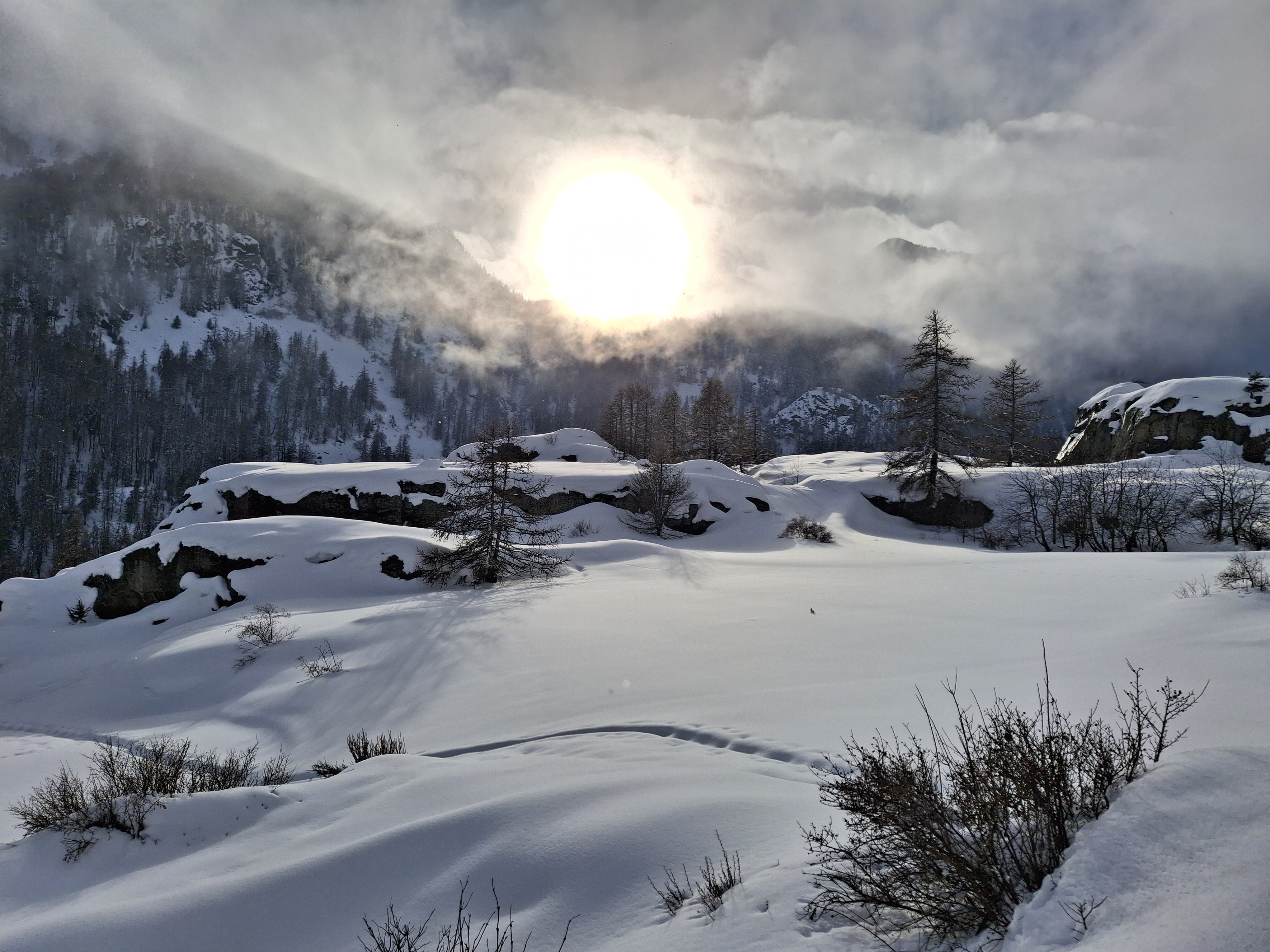 ⛷️Pour ce dernier jour, nous optons pour un retour maison par le col de Buffère. Les skis sont chaussés en mode descente et les derniers moments de poudre sont savourés, en slalomant dans les mélèzes pour rejoindre la Clarée. Après un peu de ski de fond, un super chemin tout tracé en forêt scintillante nous hisse au refuge de Buffère. Le col est atteint après négociation des micro-reliefs dans un jour un peu blanc. Et là, versant sud, c'est la descente de l'extrême : une belle neige très croutée, niveau expert. Très piégeuse, les skis sont prisonniers en virage et donnent du fil à retordre aux Lagopèdes. Le village du Mônetier-les-Bains, bien visible en dessous dans la vallée, paraît bien loin ! Beaucoup d’efforts physiques et mentaux sont déployés pour plier cette pente. Tout est essayé, des sauts, des roulades artistiques, grimper aux arbres… tout est bon pour descendre ce versant. Une pause pique-nique recharge les batteries. La neige devient plus sympathique, presque une neige de printemps, parfaite pour le slalom dans la végétation qui se densifie. L'arrêt de bus du Freyssinet est finalement atteint, 6 minutes avant le dernier bus du dimanche. Large !