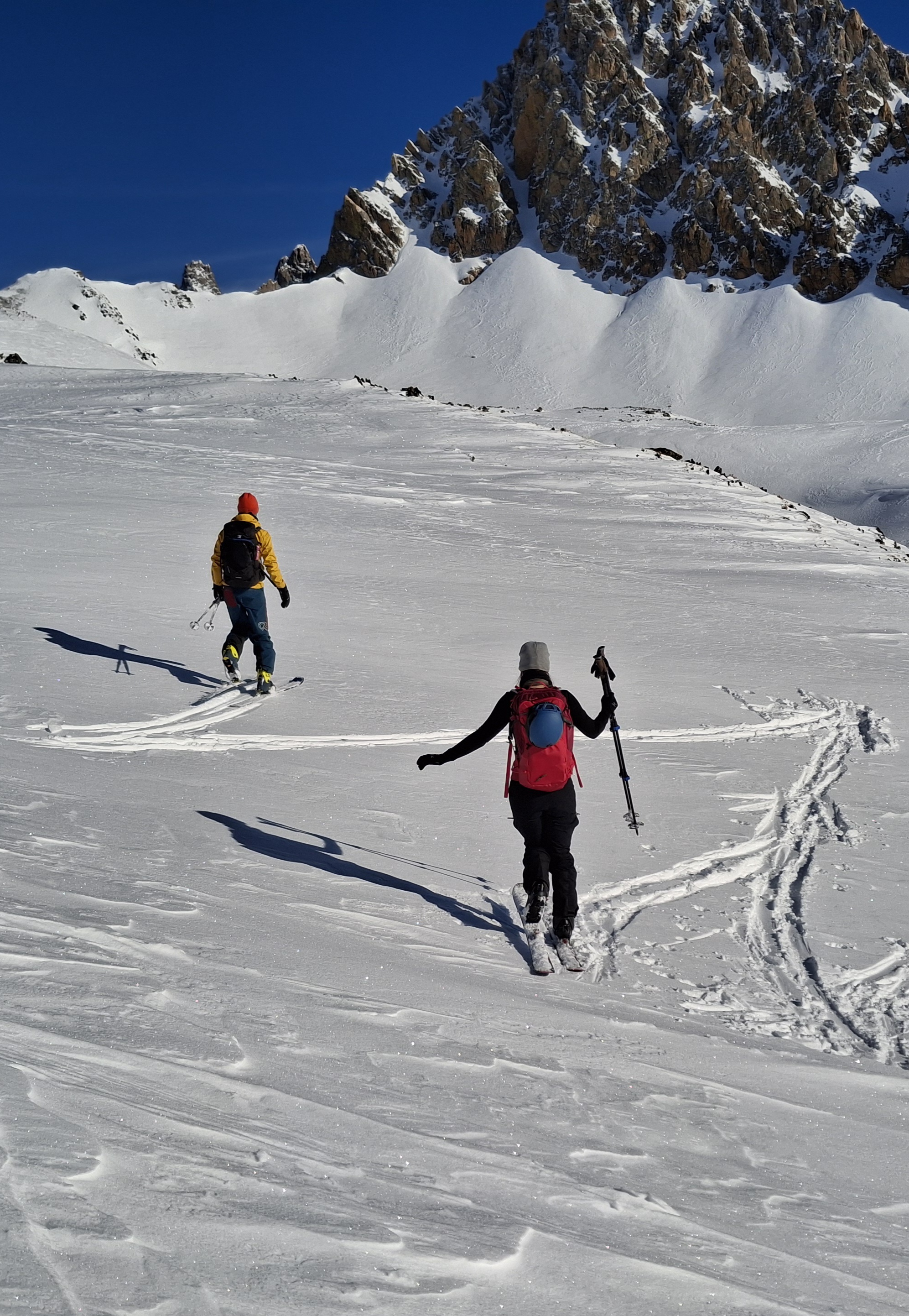🎿Le lendemain, le soleil et ciel bleu sont de sortie, nous aussi. La Crête de la Ponsonnière est visée avec un itinéraire bien éloigné des pentes raides. Le terrain est analysé au fur et à mesure et le choix de la trace est discuté. Au profit d’une petite montée, un exercice de conversion sans les mains est mis en application par les Lagopèdes pleins d’entrain. L’objectif d’amélioration d’équilibre et d’efficacité est rempli. A la crête, les Aiguilles d’Arves sont admirées, tout en dépeautant efficacement. A la descente, les micro-reliefs sont négociés pour skier des pentes faibles et se faire plaisir dans de la neige à l’abri du vent. Un petit bonus touristique est choisi pour tracer un peu en direction du col de Béraude. Le retour refuge est enclenché assez tôt pour profiter des derniers rayons de soleil avant la perturbation suivante. Les pentes douces sont skiées avec légèreté et sourire au-delà des oreilles. Et cela laisse le temps de faire un exercice individuel de double recherche DVA. Cette fois-ci, le manteau neigeux étant bien épais, le sondage est bien nécessaire pour trouver les 4 sacs enfouis à plus d’un mètre. L’exercice a lieu sous le vol des corbeaux qui se régalent d’un malheureux bouquetin accidenté. Ambiance. Nous ne resterons pas pour le repas des gypaètes, c’est l’heure du souper au refuge pour nous.