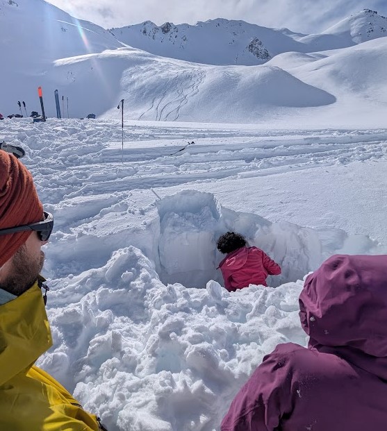 ☃️Pendant que certains se remplissent l'estomac, l’encadrante décaisse 3 m3 de neige. Bon, il n'y a pas d'âge pour jouer dans la neige… mais le prétexte officiel est pédagogique. L'idée est d'aller voir concrètement Celui-dont-on-a-peur-quand-il-est-caché, le doyen de la famille des grains anguleux, l’irréductible gobelet, le ^. Le responsable des fameuses « sous-couches fragiles persistantes », présentes depuis le début de l’hiver. Une fois le ravito terminé, la belle coupe de neige est prête pour l'observation ! Alors, pour les tests rigoureux, réalisés grâce à des scies adéquates, les super vidéos des nivologues professionnels sont parfaites. Mais avec cette coupe de neige non conventionnelle jusqu'au sol, le phénomène d'effondrement des sous-couches fragiles est bien observable. Le mille-feuilles du manteau neigeux est flagrant, avec une sous-couche fragile vers 80 cm et une au sol bien épaisse. Cela permet de concrétiser la prose des bulletins d'estimation de risque d’avalanche.