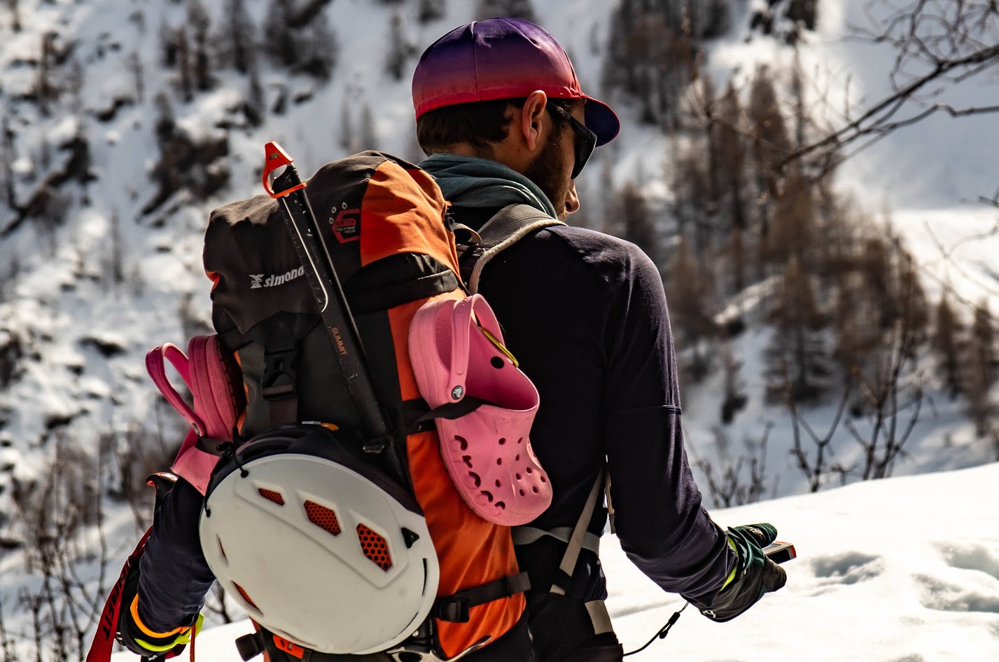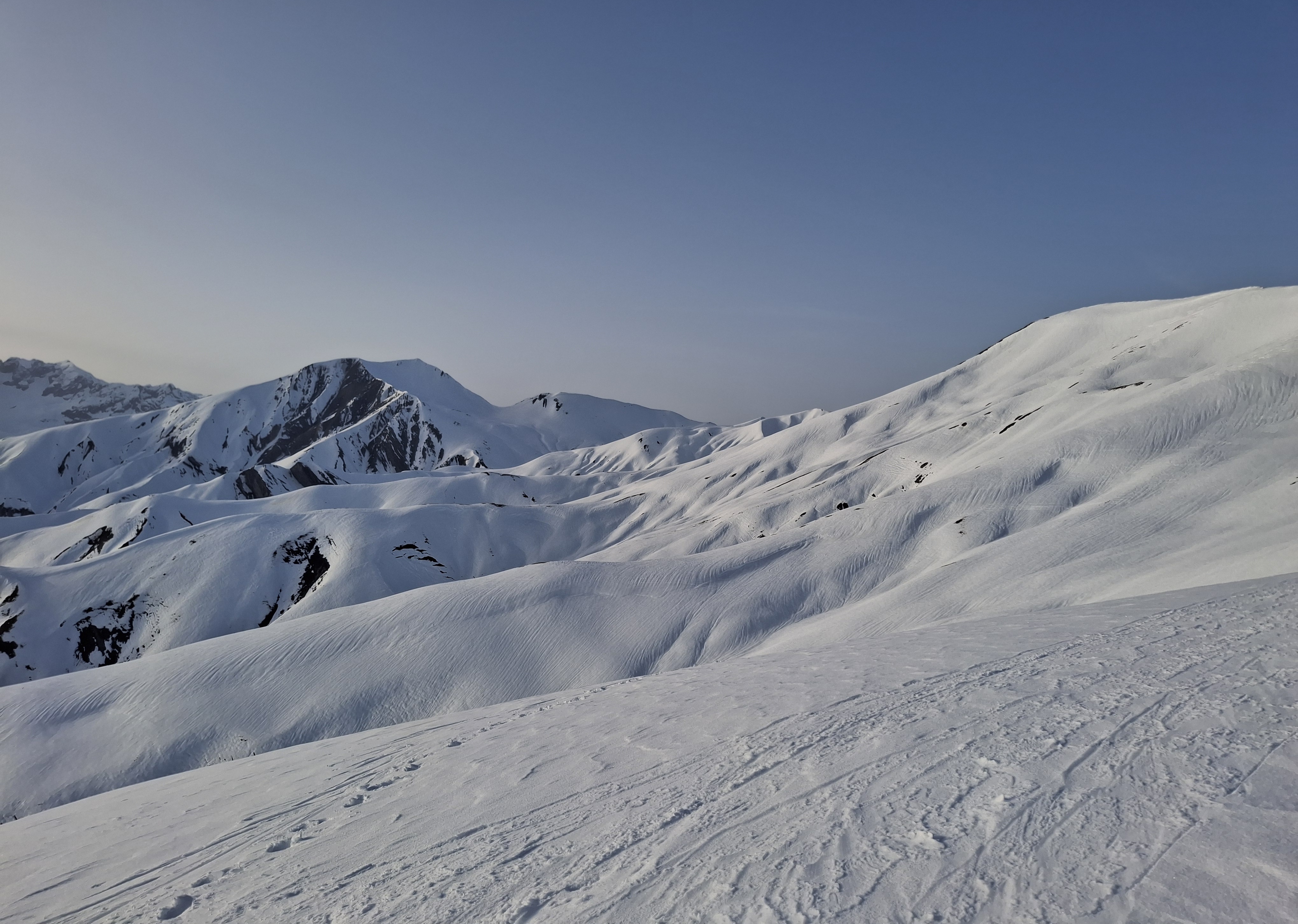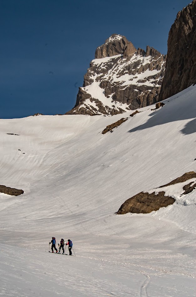 🩴Arrivés sur la crête terminale du Pic du Mas de la Grave, enneigée comme il faut, les crampons nous amènent au sommet. S'ensuit une descente vers un joli voyage : belle combe en neige froide côté est, petite remontée au chalet de l'Infernet (tous les modes sont permis pour ces 50 mètres : avec peau, sans peau, ski au pieds, skis sur sac...). Puis redescente printanière à la croisée de 3 ruisseaux avec petite incertitude sur le caractère canyoning du passage : la carte indique de beaux goulets... Finalement, le point triple est bien rempli de neige, il se passe sans même s'en apercevoir. Une dernière remontée permet de se hisser sur la crête de la Buffe et d'arriver en plongeant au-dessus du refuge du Pic du Mas de la Grave par une belle moquette douce et accueillante, tel un retour à la maison.