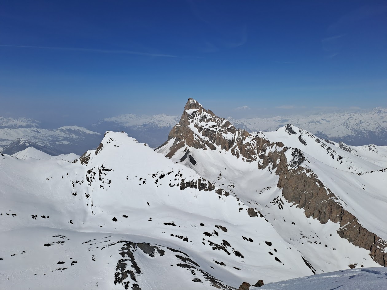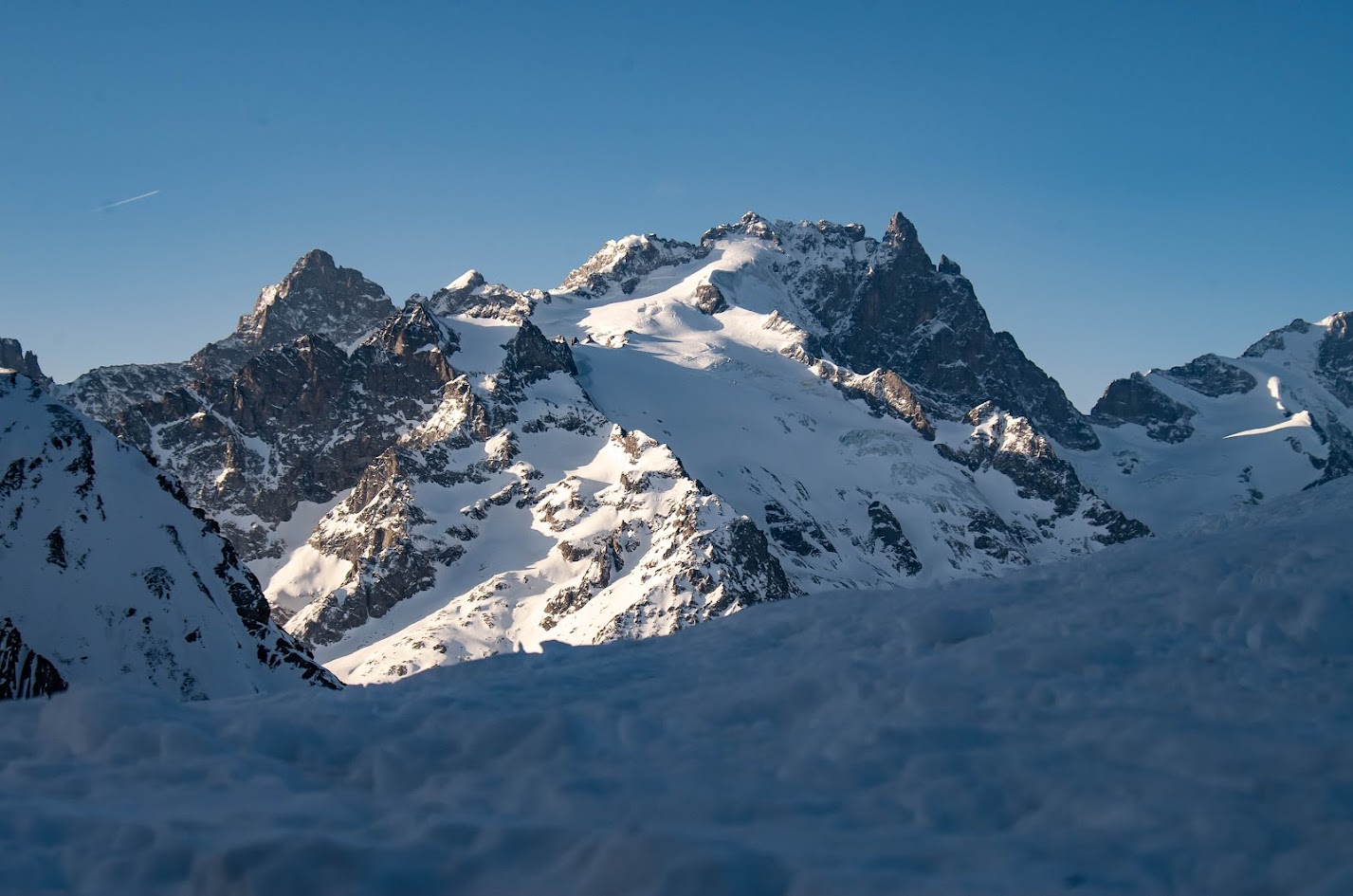 💉Le deuxième jour, forts des connaissances engrangées la veille sur la neige locale, et ravitaillés par une croziflette poireaux champignons, double, voire triple ration, nous partons pour le pic éponyme du refuge. Grand beau, neige stable, pas de vent, que rêver de mieux ! Un voile saharien empêche de bien voir les lointains, mais bon, le Mont Blanc au fond n'est pas le plus grand intérêt du lieu. La Meije à côté reste majestueuse et surtout les Aiguilles d'Arves, la Pointe Salvador, les Aiguilles de la Saussaz et l'Aiguille du Goléon nous présentent leur meilleur profil : 7 aiguilles à la suite…