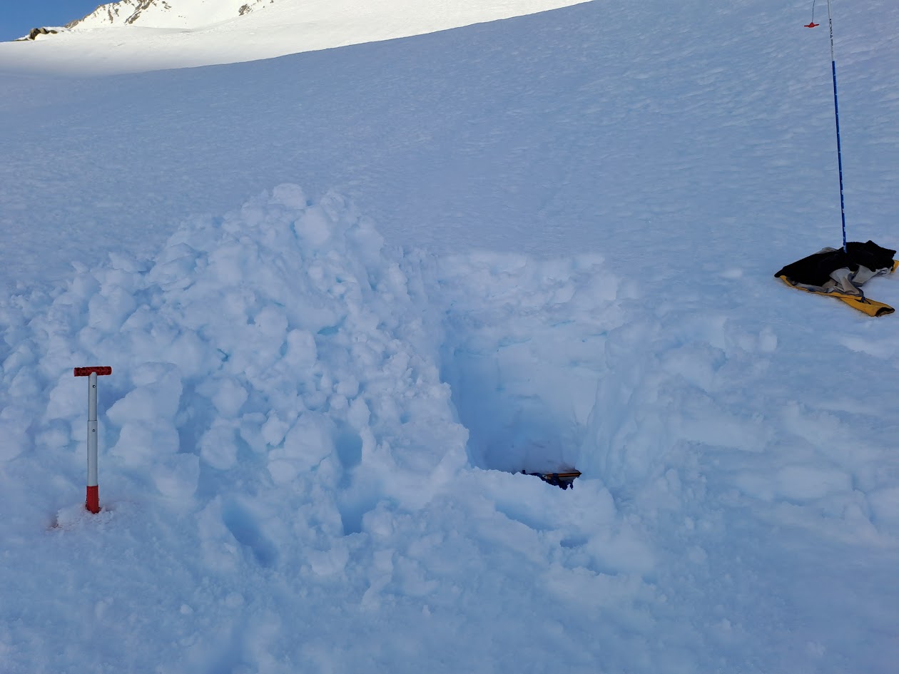 ⛏️Au col, certains, dopés par leur entretien annuel, osent prendre la casquette de leader Lagopède dans une pente d’une skiabilité douteuse. Un super ski feuille permet de passer en sécu et en confiance. Une fois la pente piégeuse descendue, le glacier nous offre une immensité régulière où les grandes courbes sont les bienvenues. Le ruisseau qui alimente le lac du Goléon est rejoint et la sonde est sortie : le sol n'est pas touché, plus de 2 mètres 40 de neige. Ok l'endroit est propice à l’exercice d'ampleur de fin de cycle : 2 groupes de 3 préparent les festivités pour l'autre groupe. De nombreux sacs avec DVA sont enfouis à plus d'un mètre. Un Lagopède, grisé par le pelletage, crée une véritable grotte souterraine pour famille nombreuse... le sac sera caché à 1 mètre 40.
