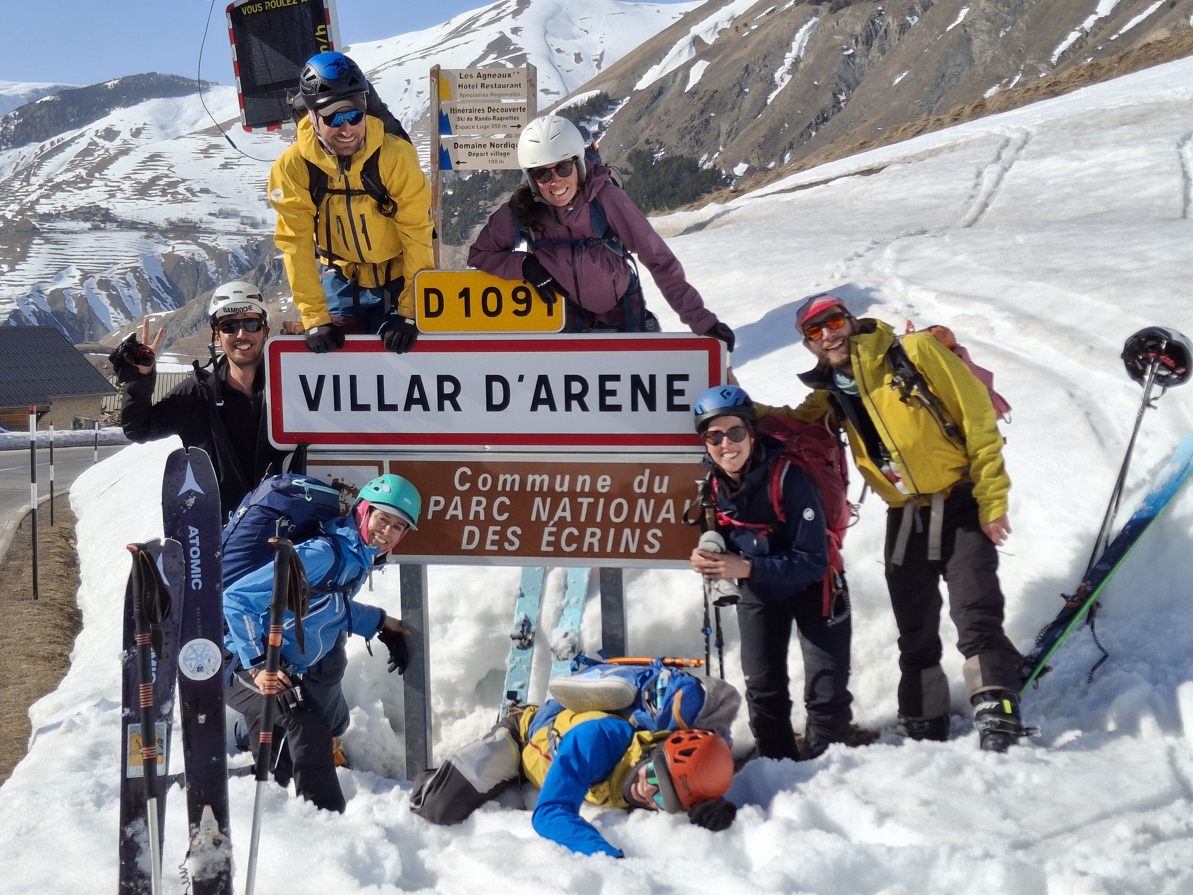 🛝La neige devient alors transfo sympa, les jambes des Lagopèdes disent merci. Le col de Pare à côté de l'Aiguillon est remonté pour basculer côte Villard-d'Arêne, promesse d'arrêt de bus accessible en ski... Alors, au prix de deux traversées de combes en balcon, quelques pas remontant, un super slalom sur les plaques de neige restantes entre des zones bien herbeuses ou caillouteuses, quelques doutes (ça ne passe plus là ! ah si si, là, à droite quelque centimètres de blanc sont là ! youhou ! à nouveau tout blanc...), quelques sauts et plongeons maîtrisés, le panneau routier d'entrée de Villard-d'Arêne est touché à ski. L'arrêt de bus est rejoint et le trajet de retour familier entamé. Les Lagopèdes retrouvent Lyon en totale autonomie, après avoir définitivement quitté le nid (et s'être séparés des deux encadrants en route vers d'autres projets montagne).