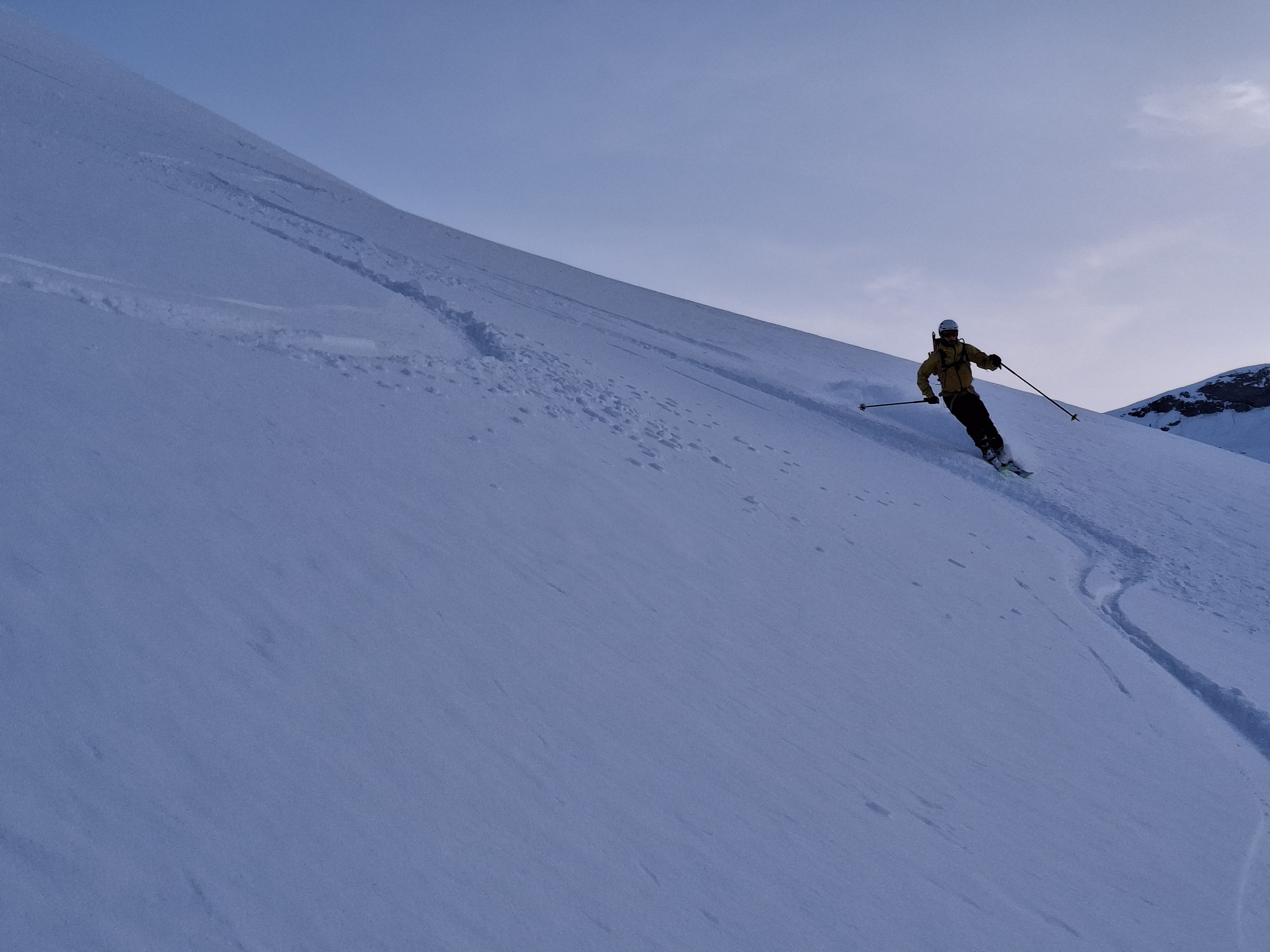 🪢Nous aurions pu choisir la route directe mais les conditions étant idéales, l'option "visite du coin" par la crête de la Petite Buffe est retenue. Différents versants sont testés : plein ouest, mmm bien stabilisé, neige un peu décaillée, plein sud, mou ce qu'il faut, bonne cohésion, plein est à 17h, ça regèle déjà... descente côté ouest, neige un peu dure… hou contrepente nord, pow pow pow, poudre ! 10 virages qui changent toute la perception de la descente. Il ne reste plus qu’à traverser le ruisseau et remonter 10 mètres qui en paraissent 100 pour certains (il y en avait 30 en vrai...). Arrivée 18h30 au refuge, pile à temps pour le repas…