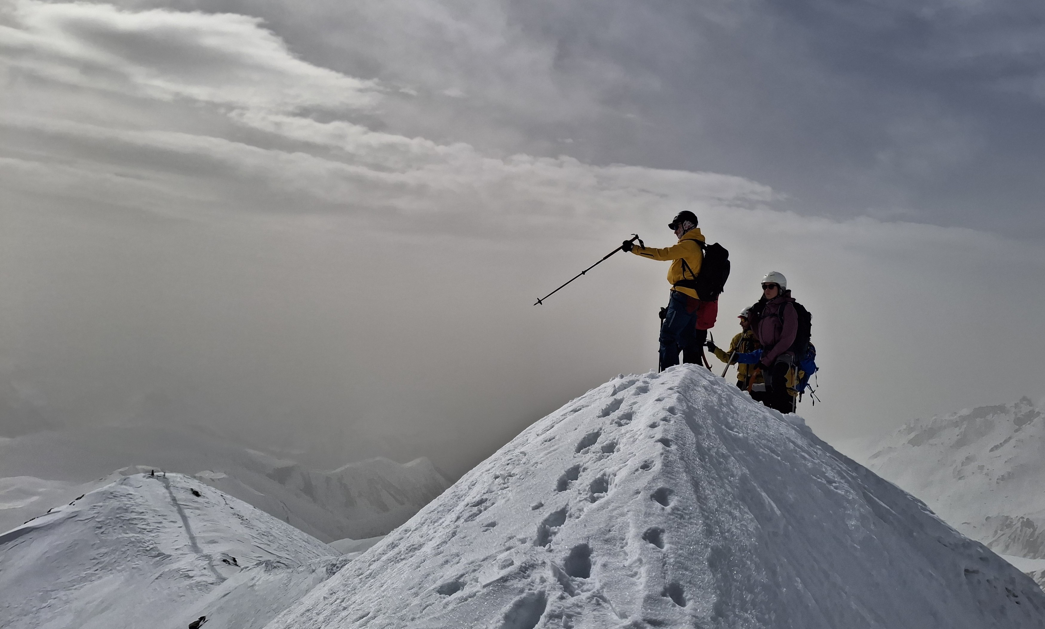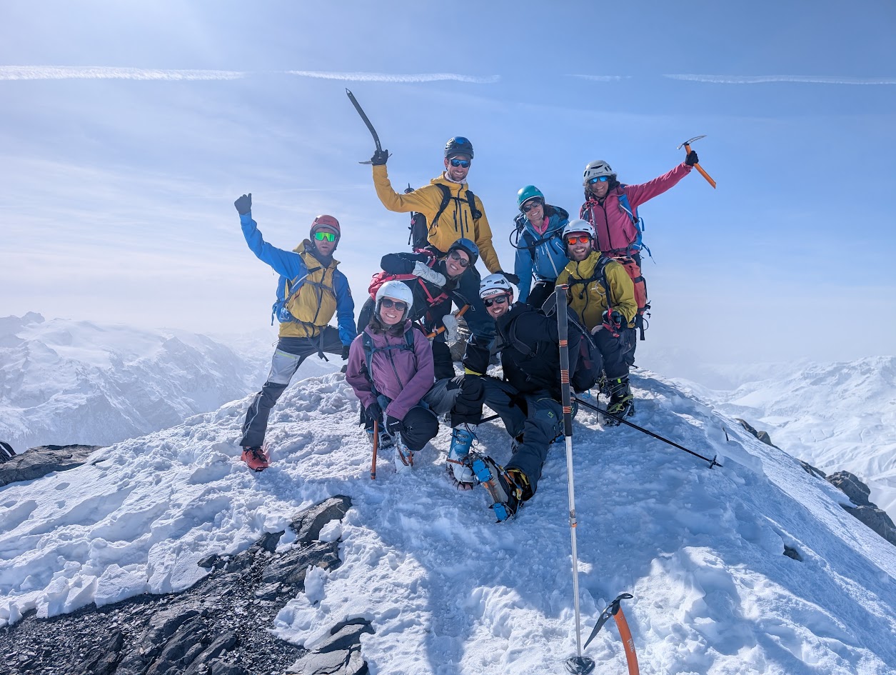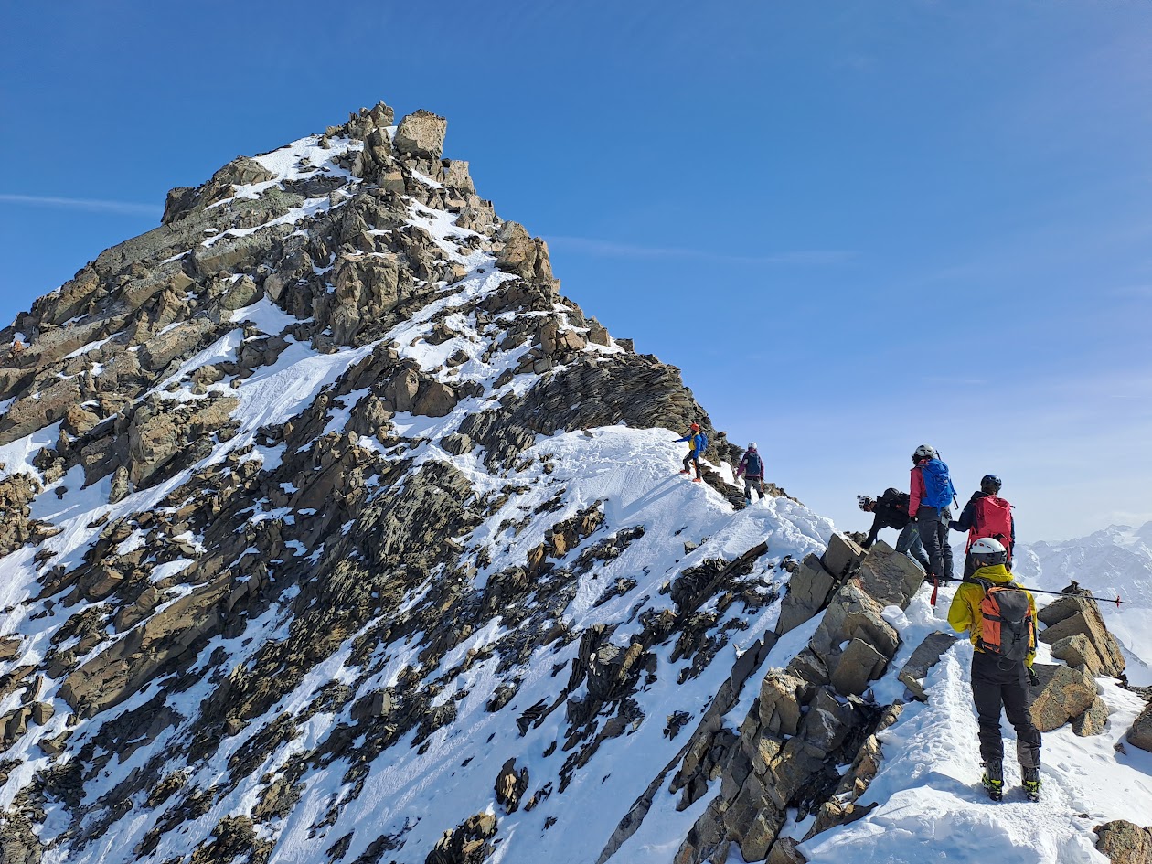 🐐Avec à une vue d’ensemble sur la suite de l’itinéraire, la voie directe pour atteindre la crête est choisie. La neige est bien travaillée par le vent, les couteaux sont appréciés. Le col est gravi et offre une vue déjà pas mal du tout. Les skis sont déposés, les crampons attachés et le piolet libéré. L'Aiguille du Goléon ne parait pas si loin, mais comme attendu, la crête est une belle section. La progression se fait en arrête mixte, avec de la neige qui accroche, quelques petits passages rocheux faciles et quelques passages aériens sur le fil. Et là, nous rencontrons un humain d'ascendance chamois qui sautille de cailloux en cailloux. On n'a pas tous la même perception du vide. Il nous double et devient notre photographe officiel en réalisant des portraits des Lagopèdes en progression. Il pique-nique au sommet pour nous attendre et faire une photo de groupe. Puis il repart comme il est venu, bondissant sur ses crampons. Nous revenons prudemment à nos skis, en prenant le temps qu'il faut pour se sécuriser et profiter de l’expérience.