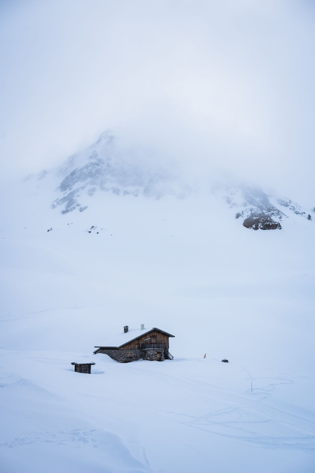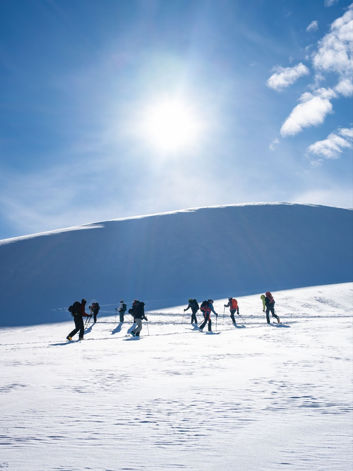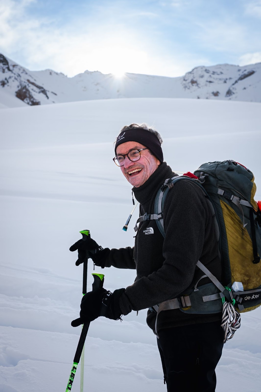 7h30, petit déjeuner servi. 8h32, chambres libérées. 9h00 presque tous équipés. Nous avons été assez efficaces et c’est dans une brume épaisse que nous chaussons nos skis claclac!. On n’oublie pas le check DVA et formons à nouveau deux groupes. Aujourd’hui, mes encadrants sont Jean-Philippe et Jean, le MacGyver des montagnards qui, à coup de scotch américain, répare une peau de phoque en deux coups d’opinel. La brume se lève progressivement et le soleil fait son entrée sur scène : une nouvelle journée maussade commence ! C’est atelier conversion dans la première montée et petit à petit, les réflexes viennent.