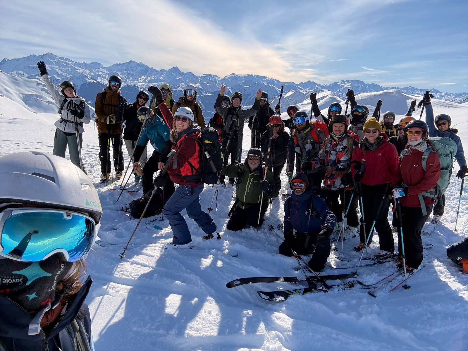 Le groupe au complet se reforme au sommet, un selfie maussade avec toute la team et une vue de folie sur tous les massifs voisins et il est enfin l’heure que tout le monde attend… Dé-peauté ! Des petits pépins matériel nous prennent du temps mais nous finissons tous par passer en mode descente. Eric ouvre le bal et tout le monde se met en mouvement : il y a beaucoup de très bons skieurs mais je ne me sens pas de trop : j’y vais à mon rythme, je savoure les sensations de glisse sur une neige légère dans une pente douce et me dit que je voudrais faire ça tous les jours.
