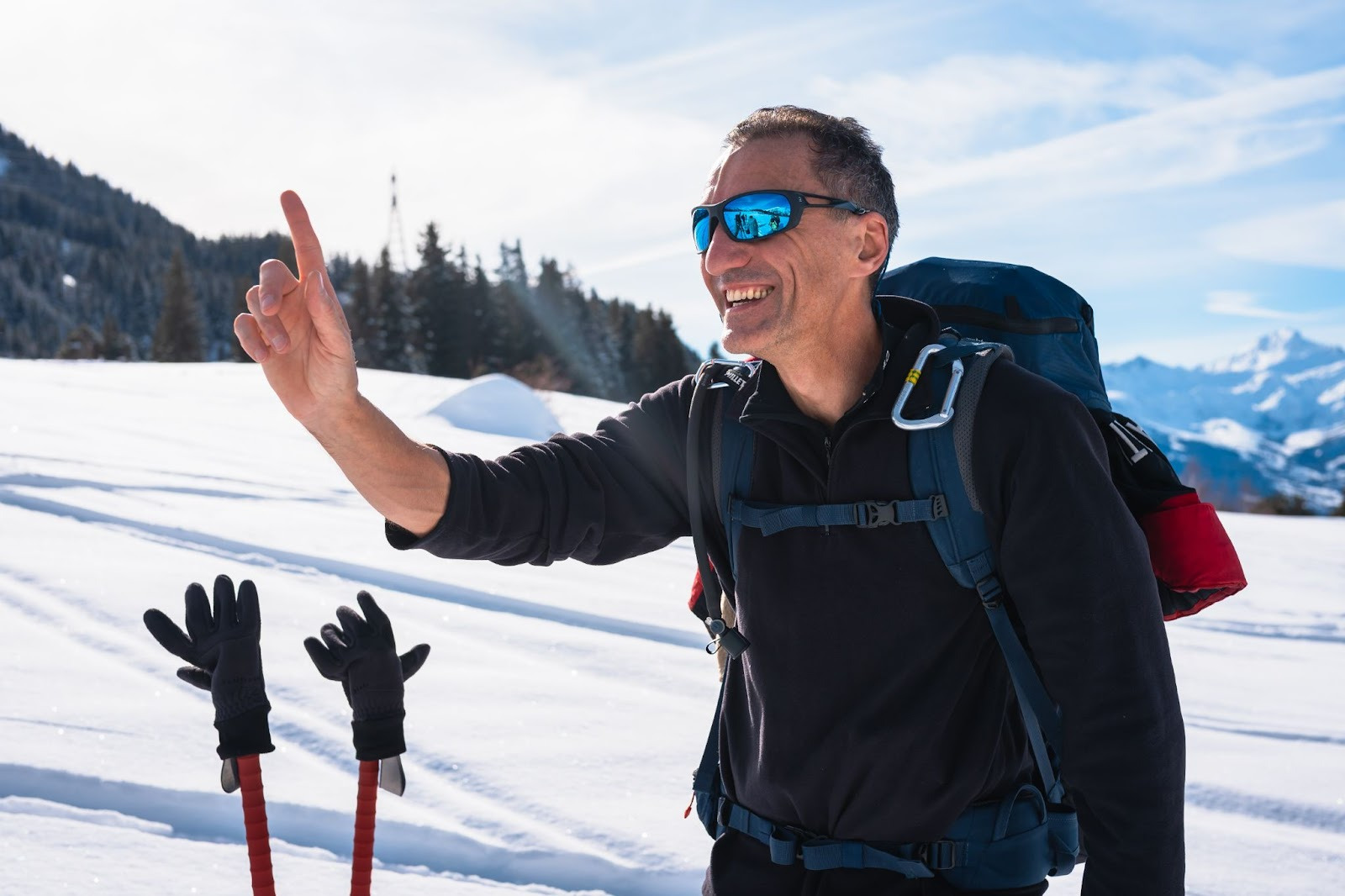 - Cinquième étape : cours de nivologie. Après l’égarement de quelques brebis (ceux qui savent… savent), nous nous retrouvons tous pour un atelier technique sur les différentes couches de neige, comment les reconnaitre, identifier les risques et apprendre à creuser pour sortir une victime d’avalanche. Les anecdotes de Jean viennent accompagner les démonstrations des volontaires qui n’hésitent pas à donner de bons coups de pelle !