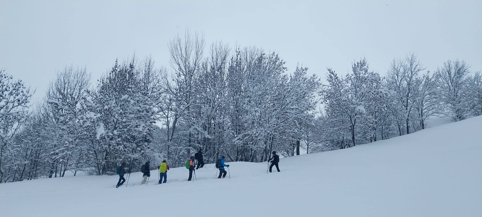 Découverte de l’équipement, on chausse tant bien que mal, et c’est parti pour une montée sous la neige. L’occasion de faire, pour certains d’entre nous, nos premières conversions et de réviser la technique pour les autres ! Pas facile dans autant de poudreuse. On arrive à une table de pique-nique pour un repas bien mérité, le soleil nous offre quelques rayons, royal. C’est reparti pour la montée, on se relaie pour faire la trace, et parfois on tombe sur un cours d’eau… Le groupe prend petit à petit un rythme de croisière :