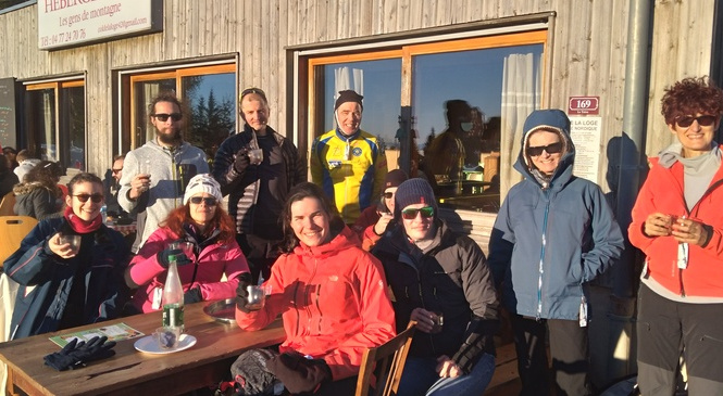 C'est notre ancienne coach Florence qui nous avait "dégoté" cette petite station de ski de fond, le Col de la Loge dans le Haut Forez, à 1h30 de Lyon vers l'ouest, donc pas plus éloignée que nos stations des Alpes. Nous y sommes retournés, pour notre grand bonheur. Sans prétention, mais bien équipée pour le ski de fond et la location, elle offre de bons kilomètres de pistes multicolores tout à fait appréciables pour une journée de skating, dans une ambiance bon-enfant loin des compétiteurs. Les fortes chutes de neige de novembre - début décembre marquent ce début de saison, le Col de la Loge est bien blanc. Après une série de "gammes" sur les spatules, quelques-uns parmi nous ont réussi à filer, d'autres sans se défiler... ont aussi pris les rails. Les Puy de Sancy, le Puy de Dôme, pour certains le Mont-Blanc, ont défilé, nous en avons eu plein la vue. Une vocation d'encadrant ski de fond est née. En fin de journée nous avons piccolé... un chocolat chaud en plein soleil.