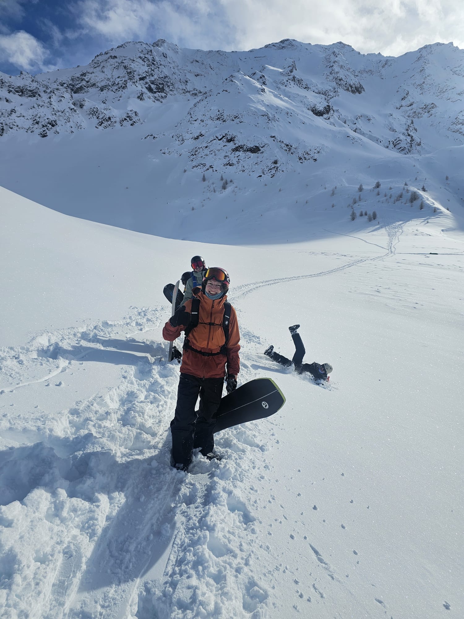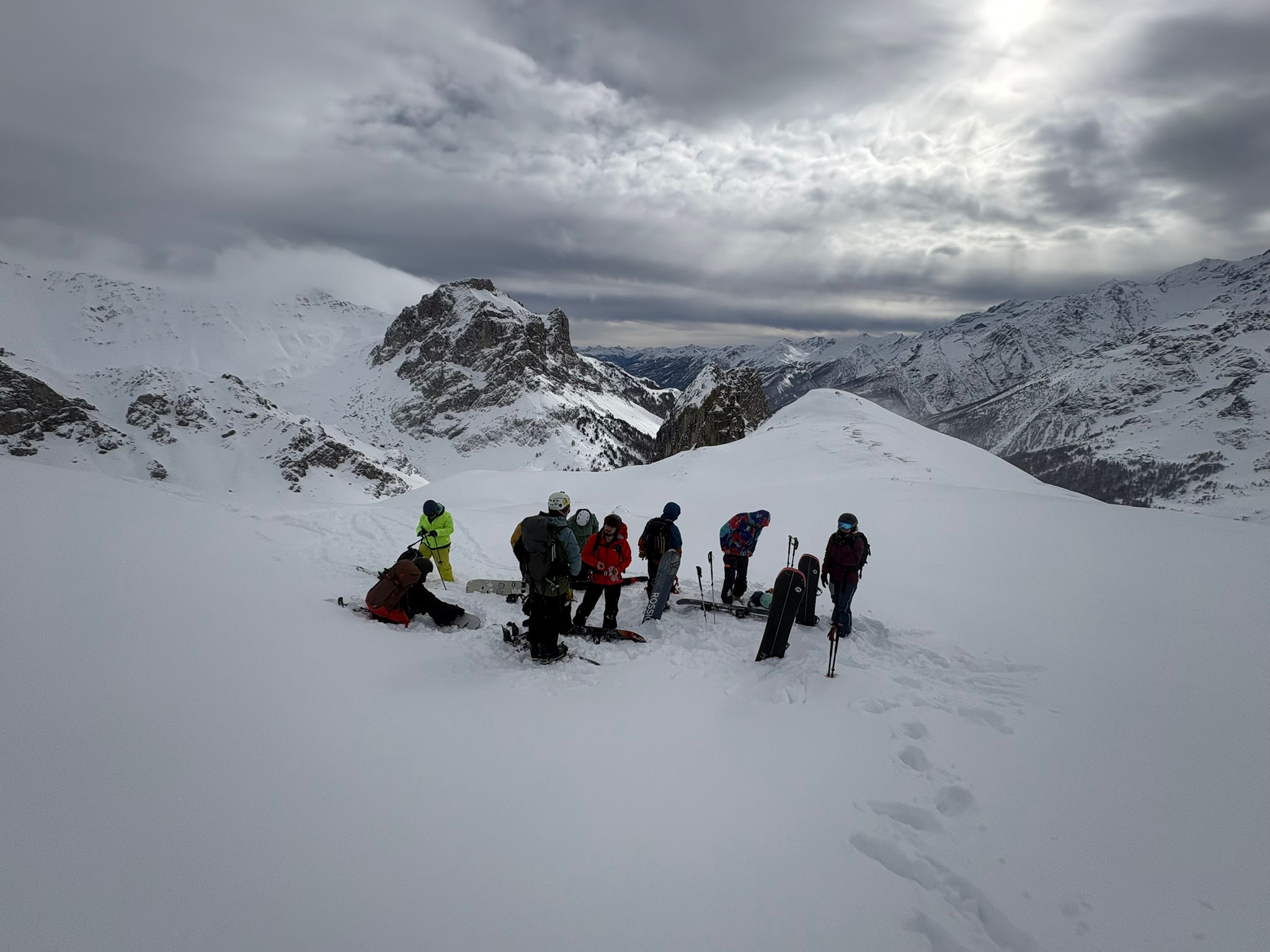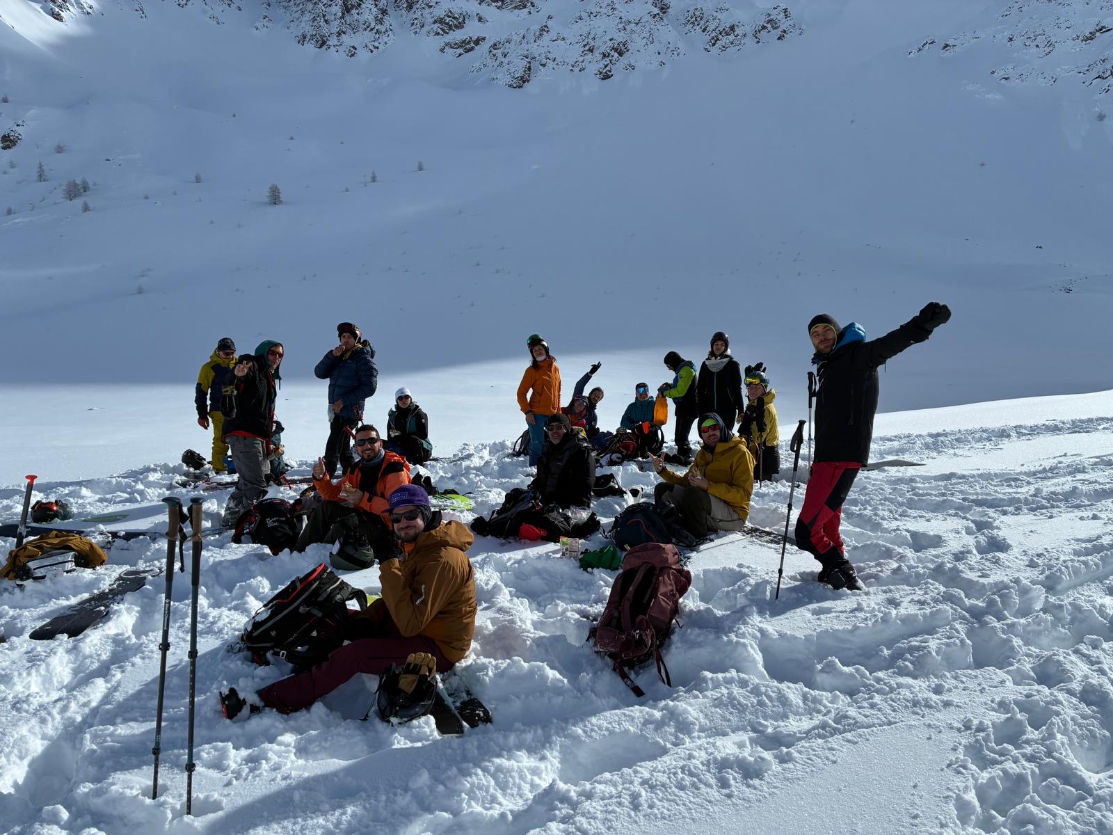 Quant à la team de la Pont d'Alpe, ils se sont sentis bien chanceux, premièrement par la poudreuse offerte par le dieu banane mais aussi par les paysages qui, il faut le reconnaître, étaient bien plus beaux que ceux traversés par l’autre team ! Pas de jaloux, ici aussi il y a eu des problèmes de fixation avec un bon petit coup de stress pour un nouveau propriétaire de splitboard (ne mangeant dorénavant plus que des pâtes, sniff) qui a galéré à réorganiser sa board pour redescendre. Spoiler alert, les vis ressortaient un peu trop en surface, un tuto pour apprendre à utiliser un tournevis a été donné sur place (on blague, c’était plus compliqué que cela en réalité !).