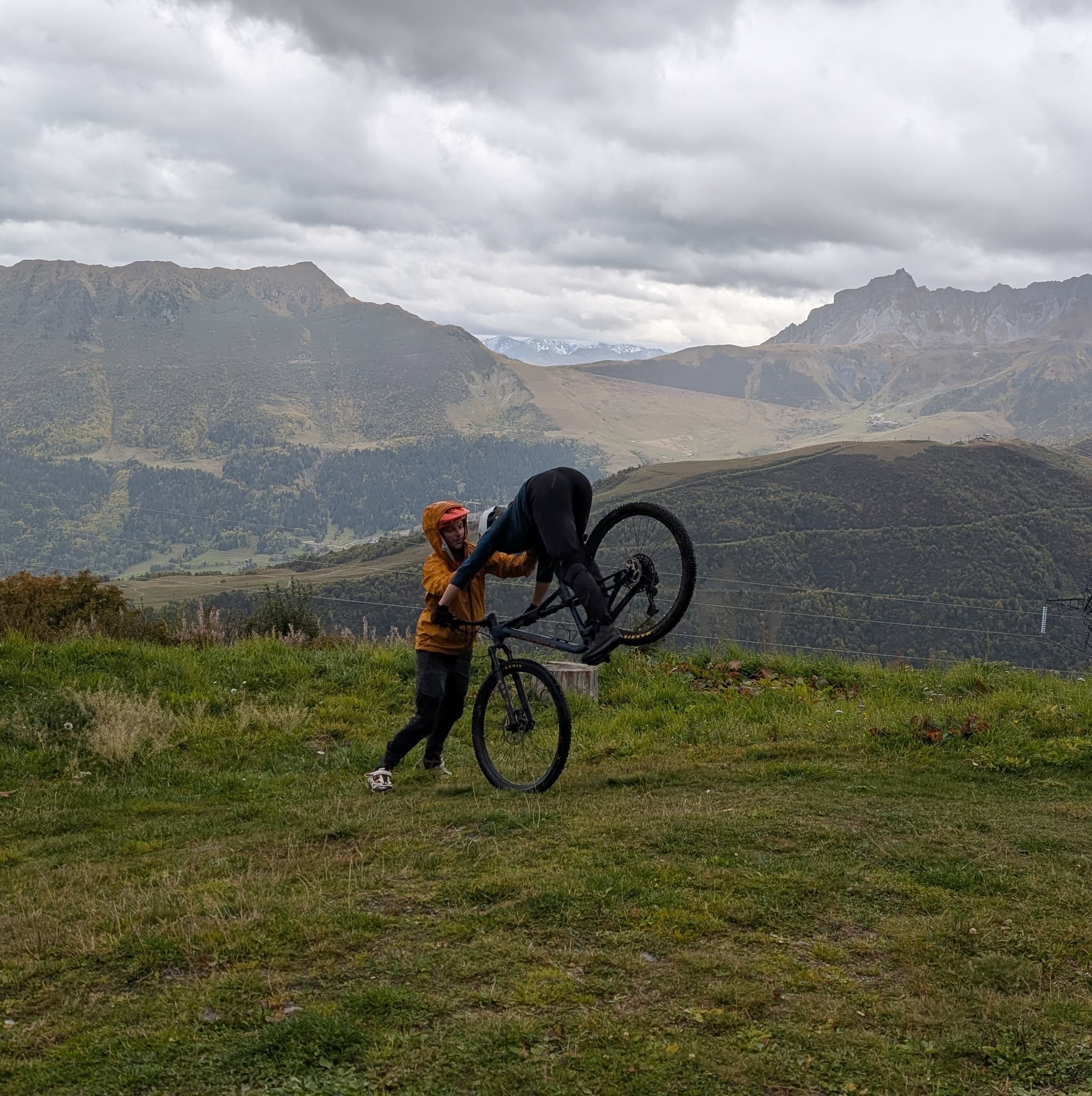 🏡Réjouis de l'immersion montagne et des apprentissages (comment porter son vélo, passage d'épingles sans (trop) poser le pied, franchissement de troncs d'arbre et de planchette), l'arrivée au Logis des fées est bien appréciée. Certaines profitent du rab météo (le déluge n'est pas encore là) pour offrir un spectacle aérien : apprendre l'équilibre sur la roue avant d'un vélo grâce à une petite butte herbeuse et un encadrant-tapis. Julien, un ancien vététiste qui rejoue de la pédale après un petite pause, nous montre le fruit de ses jeunes années de danse : le ballet à vélo n'est pas loin ! Roue avant, puis arrière, rotation...