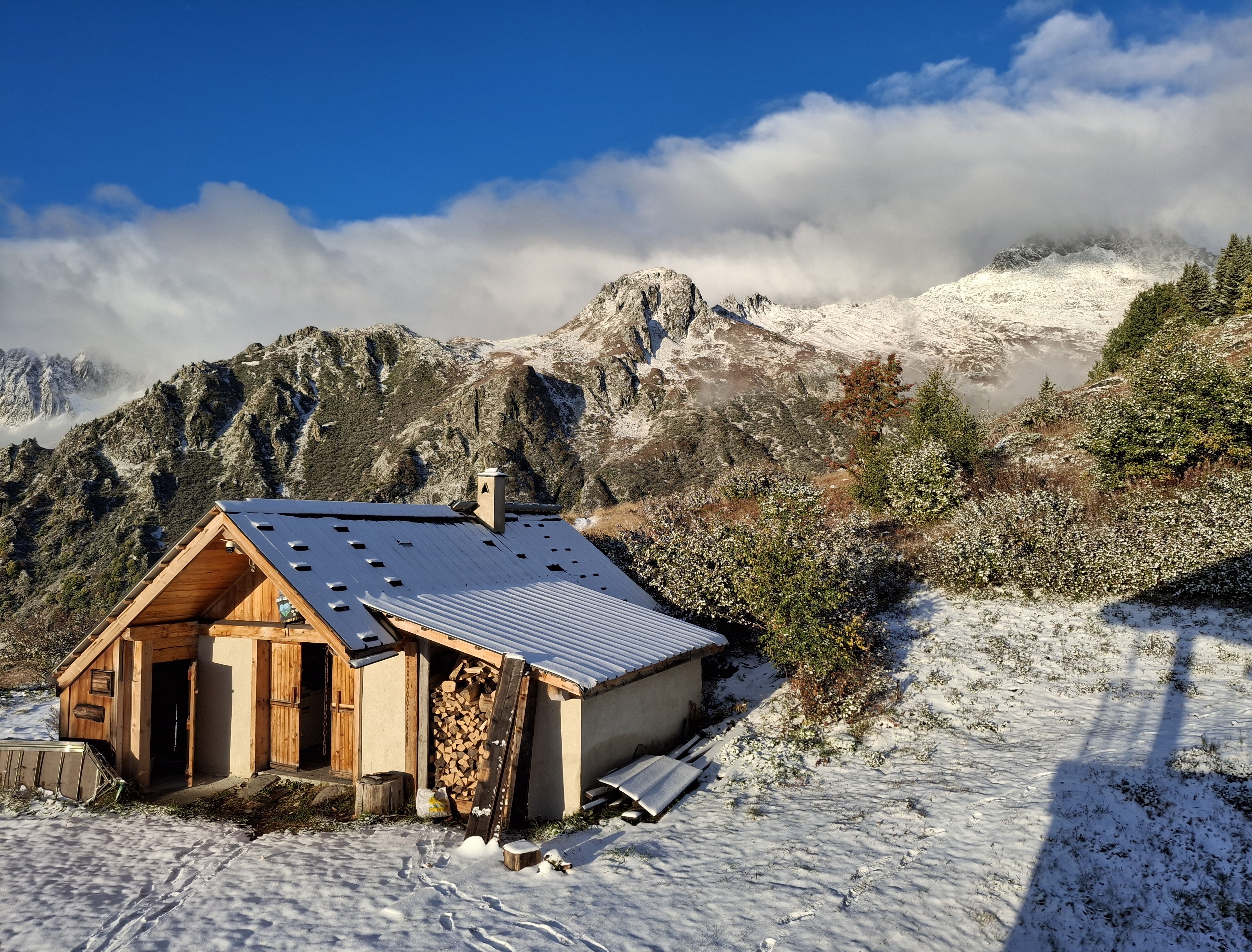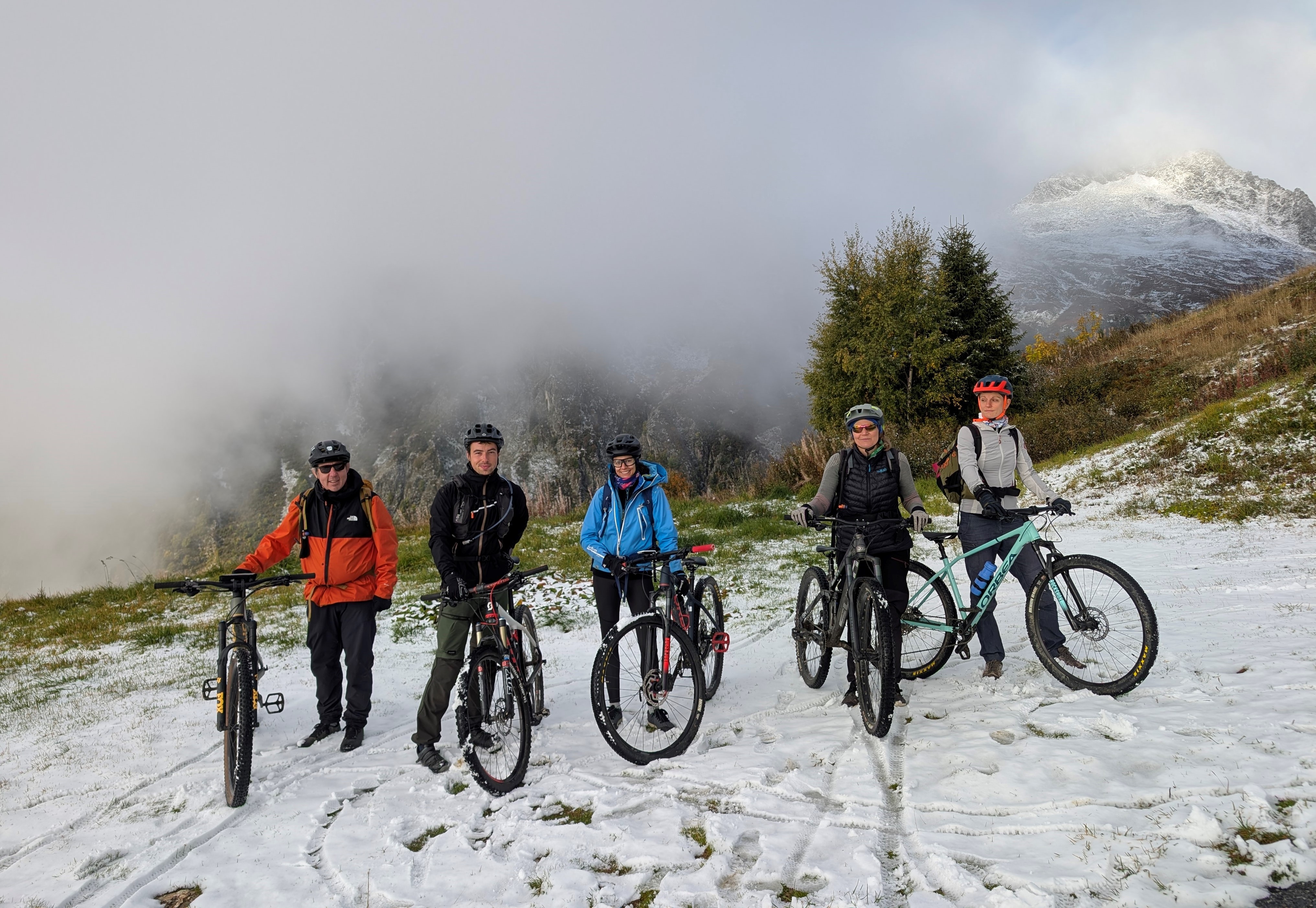 ❄️Après une soirée repos, jeux de cartes ou puzzle de minuit, le dimanche matin nous offre un spectacle féérique. Comme des enfants à Noël, nos yeux s'illuminent devant la montagne blanchie dans la nuit... Impatients de tester le crounch crounch de la neige fraîche sous les roues, les vélos sont vite sortis. Bon, certains se disent qu'ils n'avaient pas signé pour une sortie CAF raquette ou ski de rando, et se demandent bien comment ça marche le vélo à neige... Et bien, toute fraîche, ce n'est pas une patinoire ingérable. La fine couche offre un petit grip sur un fond un peu glissant. Comme un terrain humide en automne, les pneus tout terrain sont faits pour gérer une certaine adhérence.