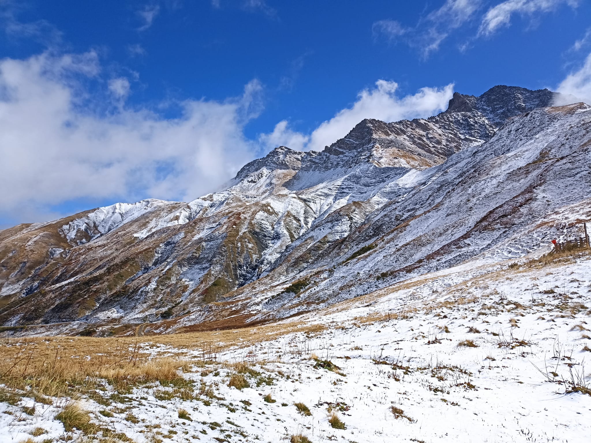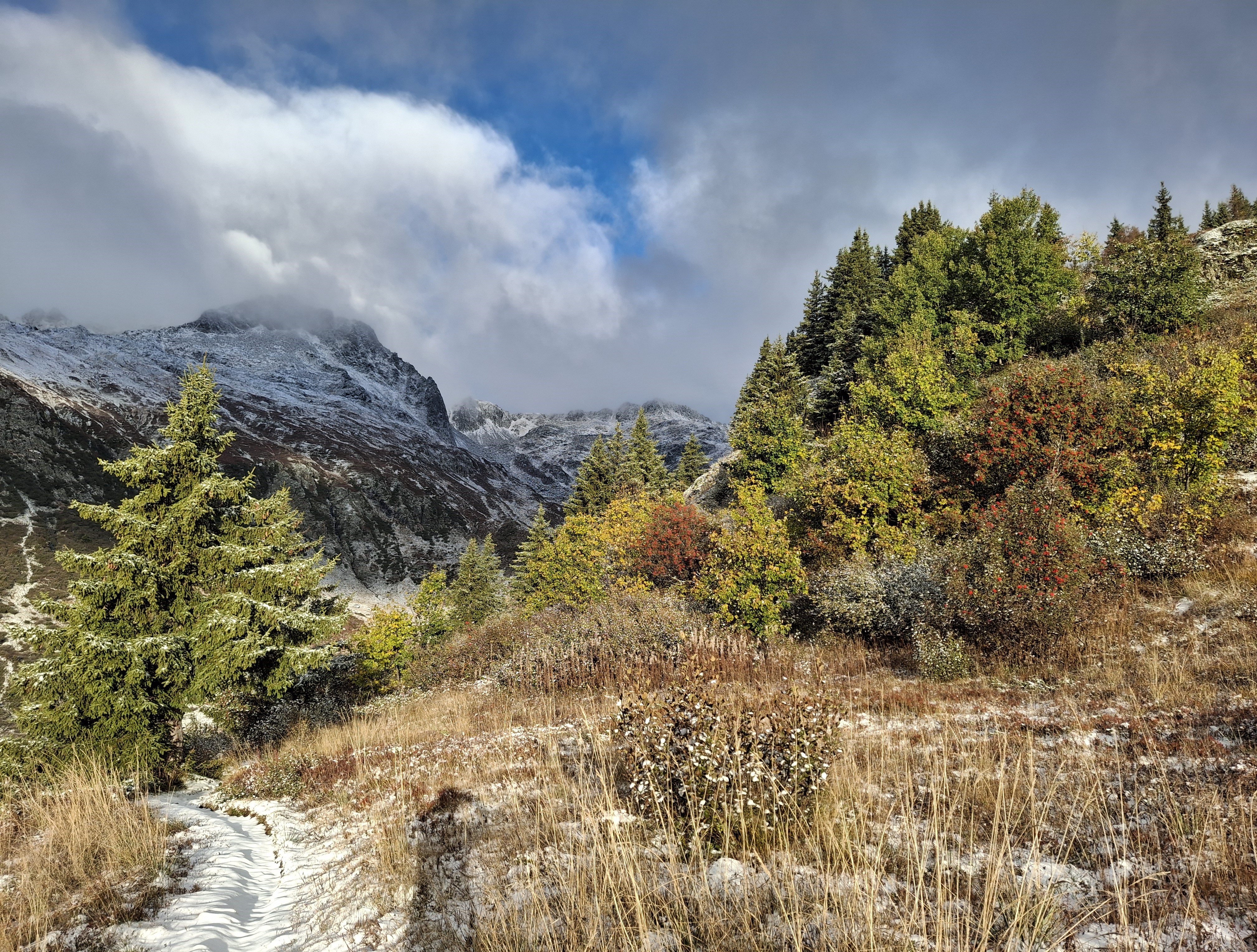 🍂Arrivés au lac de l'Arpettaz ou un peu au-dessus selon le groupe, le panorama mérite une pause. Un décor magique bi-face s'offre à nous : une page blanche à l'ouest (une belle ondée) et des éclaircies (un vert-jaune-rouge sur fond bleu) à l'est. Pas besoin d'être expert en météorologie pour comprendre que cette binarité est temporaire, très temporaire. Nous redescendons donc à proximité du refuge pour s'amuser sur des enchaînements de virages serrés, au milieu des paravalanches (ne pas sortir cette phrase de son contexte, il s'agit bien d'une sortie CAF vélo de montagne !).