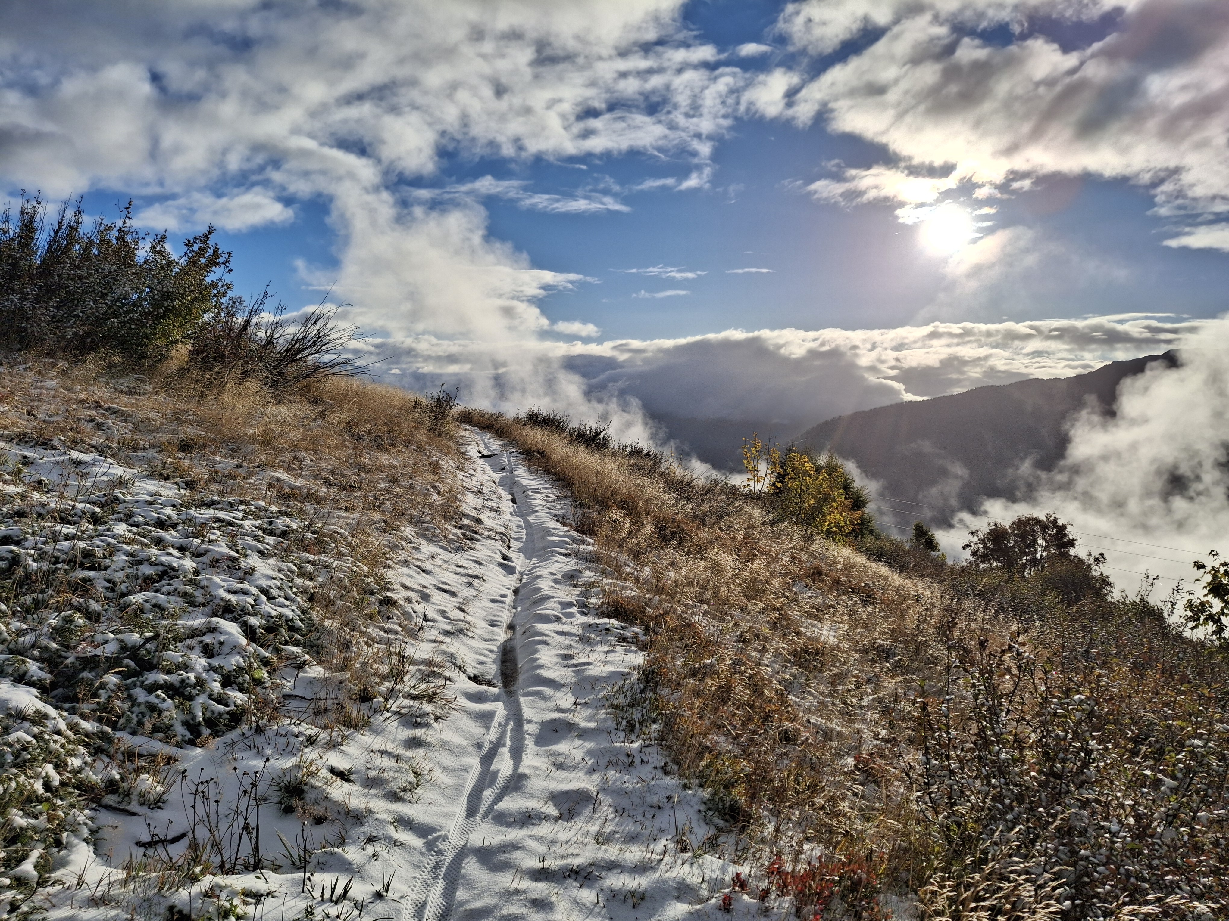 ❄️Nous partons donc découvrir la montagne en hiver à vélo. La journée est très variée. Pour se mettre en jambe, une descente sur un petit sentier joueur en forêt nous accueille. Il faut quand même rester attentif aux racines cachées sous les feuilles cachées sous la neige. Ensuite, nous remontons la vallée par un magnifique petit chemin au-dessus du ruisseau : un assortiment de feuilles d'automnes, sur son lit d'herbe verte, saupoudré de neige fraîche. S'ensuit une montée moins bucolique, néanmoins efficace, par les pistes de la station. Le panorama des sommets environnants, le Cheval Noir et le Grand pic de la Lauzière, blanchis dans la nuit, est bien motivant. Nous descendons par un tracé bien rigolo, un enchaînement de petits lacets, assez détrempés mais pas trop piégeux. Nous arrivons au parking les yeux encore tout émerveillés.
