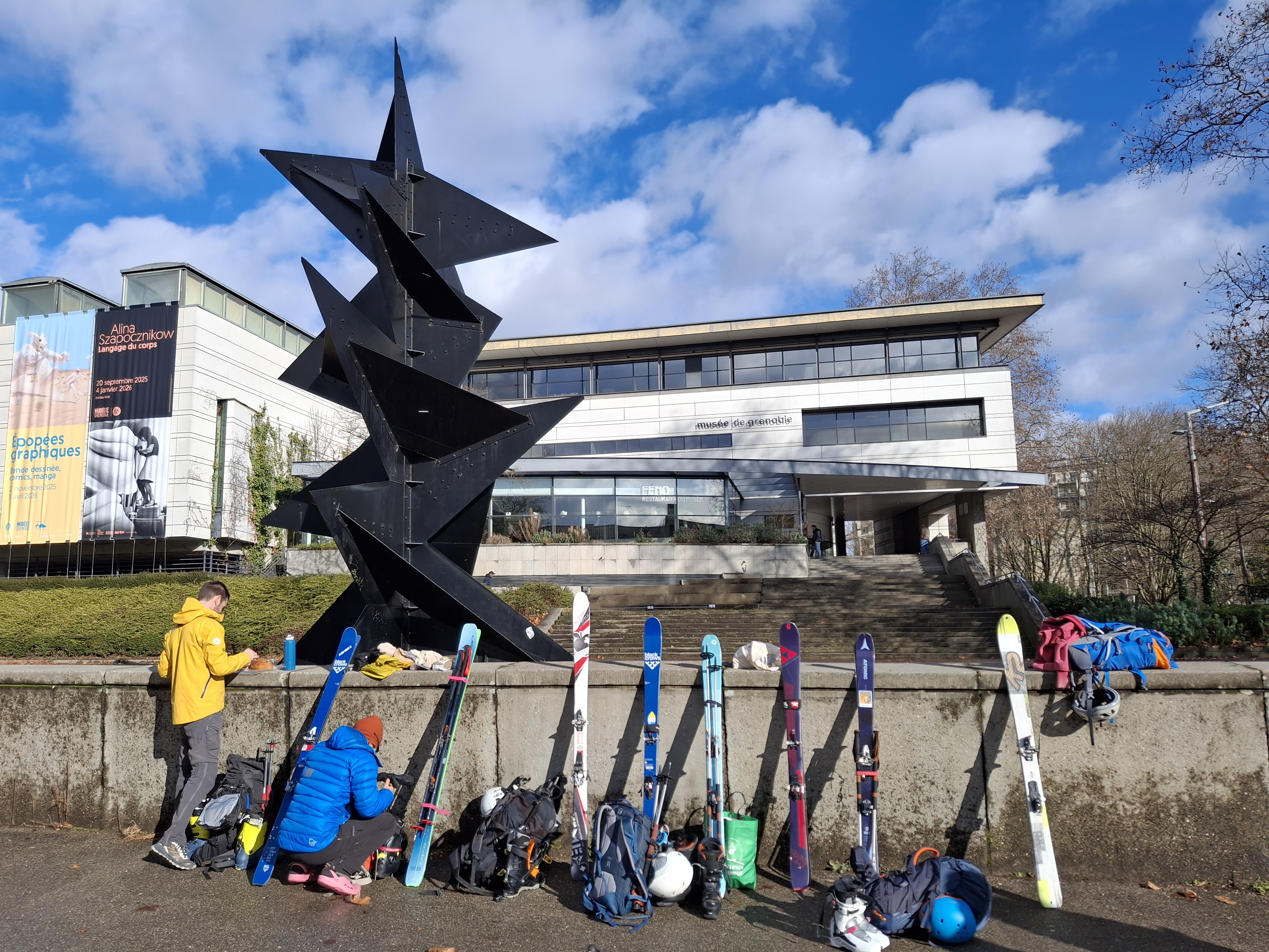 🚍A Grenoble, après une promenade sur les quais, c'est l'heure de la pause pique-nique au soleil à l'arrêt de bus. Une population autochtone est là et attend le sésame de la blanche montagne : des skieurs de fond, de rando, raquettistes, piétons, lugeurs... Le bus embarque tout ce beau monde et monte avec entrain, absolument pas intimidé par les chutes de neige de plus en plus conséquentes avec l'altitude. Au col de Porte, les skis sont chaussés directement à la sortie du bus. Parfait pour un petit exo DVA. Le manteau neigeux n'étant pas très épais à 1300 m d'altitude, le sol est vite atteint : l'apprentissage portera plutôt sur la recherche DVA en zigzaguant entre les arbres. Le sondage et pelletage seront pour les prochains week-end ! Le soir, l'équipe fonctionne en autonomie pour préparer le dahl improvisé et la galette qui intronise le roi et la reine Lagopède du lendemain. Pendant le temps de cuisson, l’itinéraire de la journée du lendemain est schématisé collectivement.