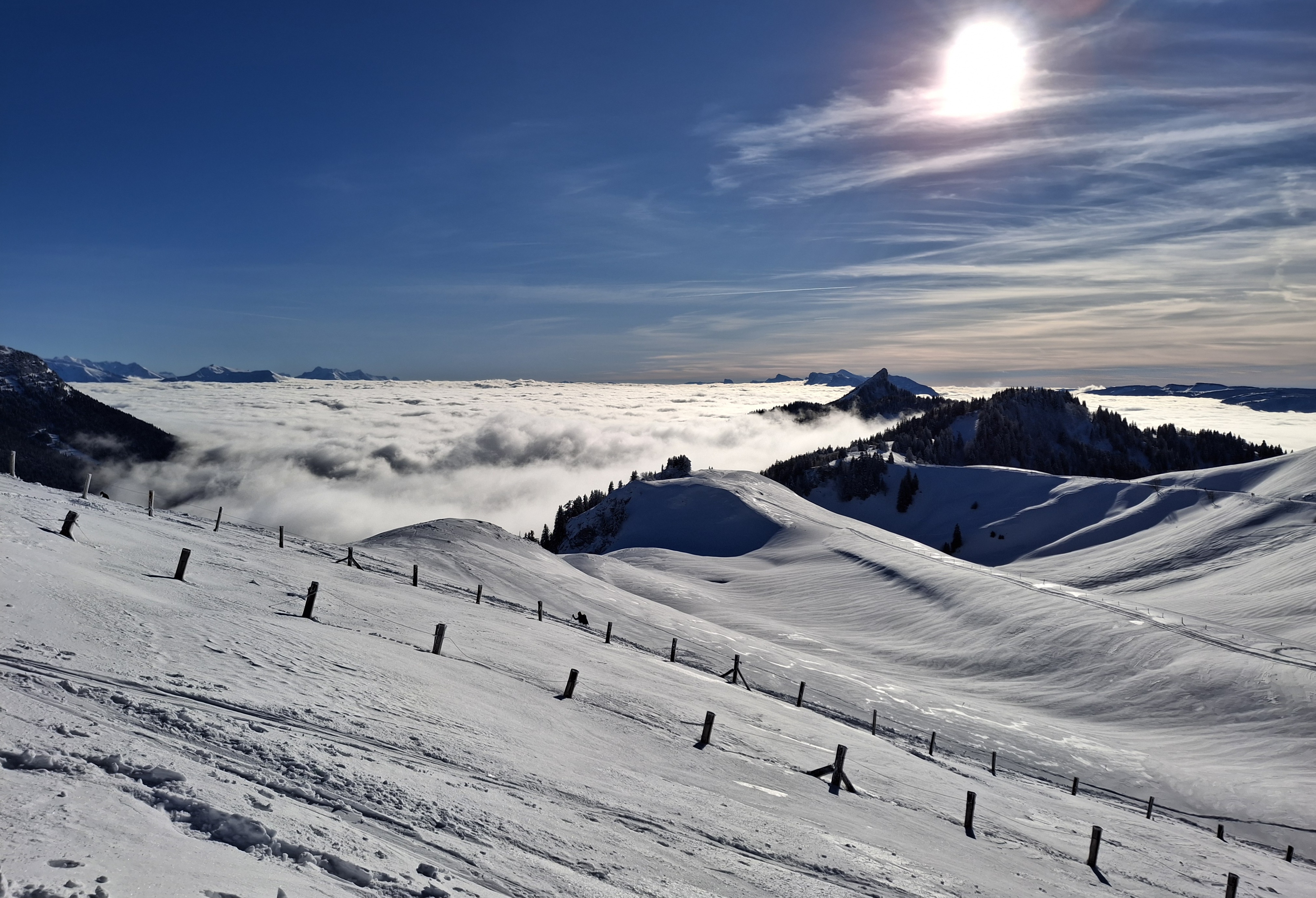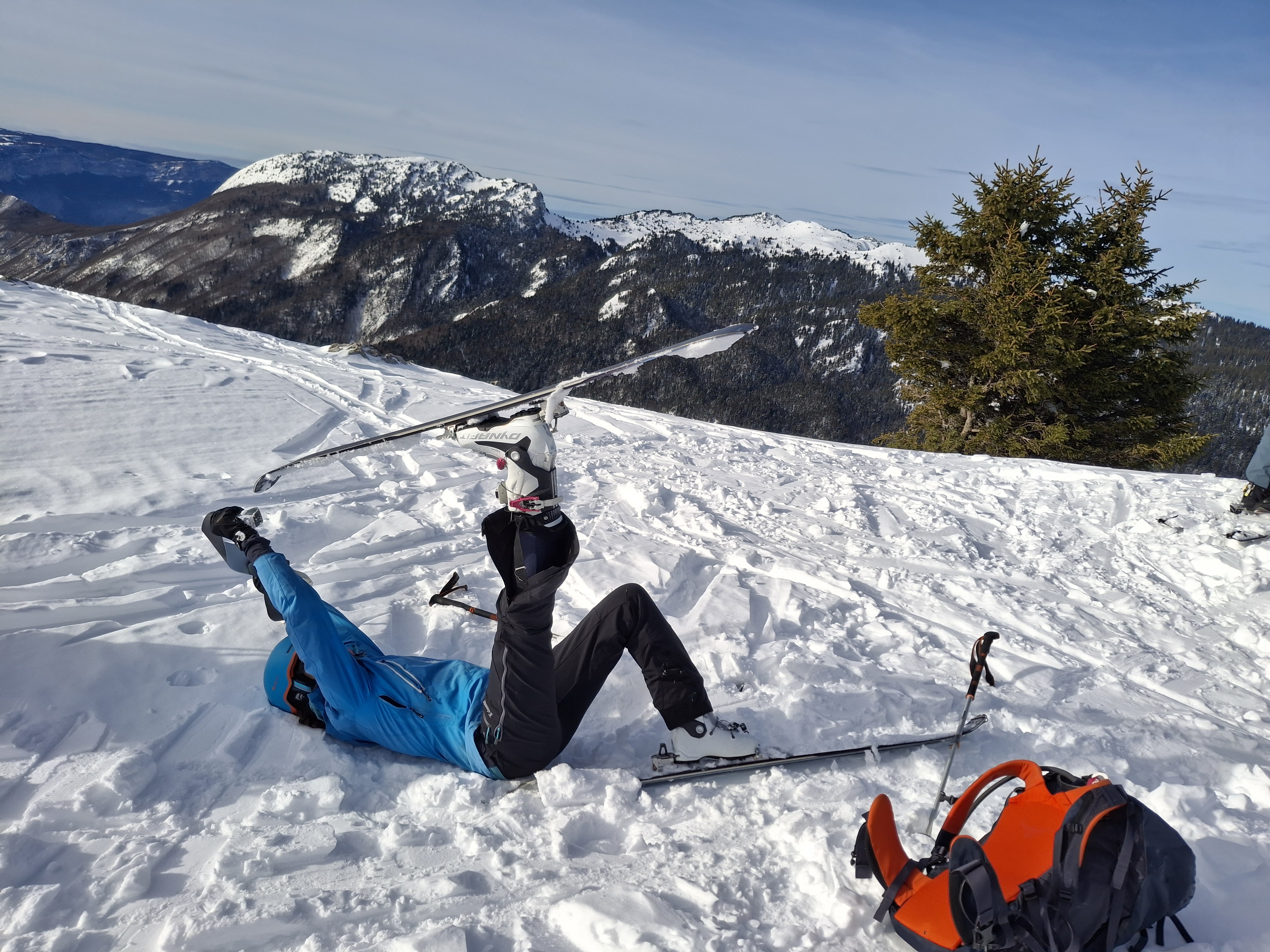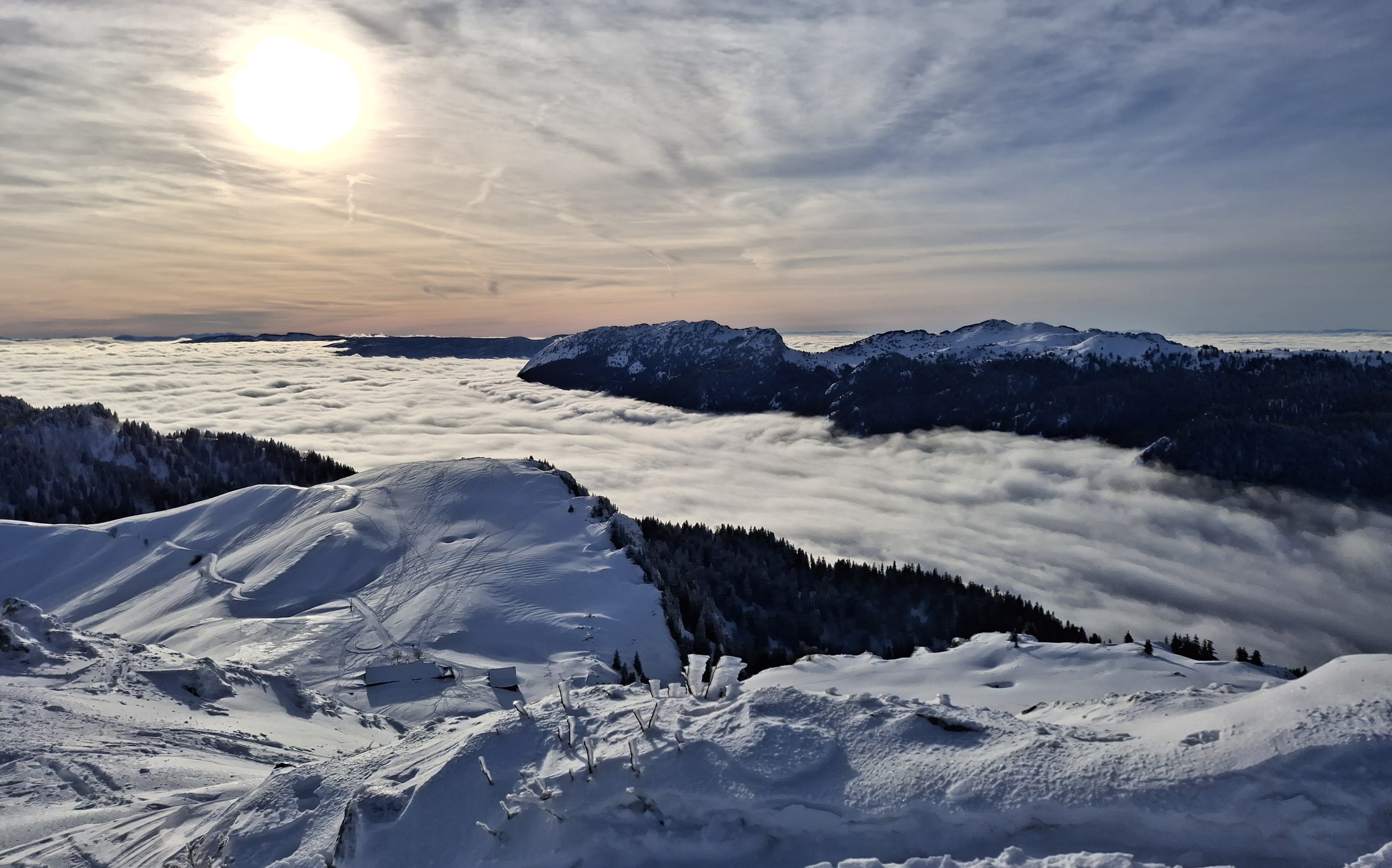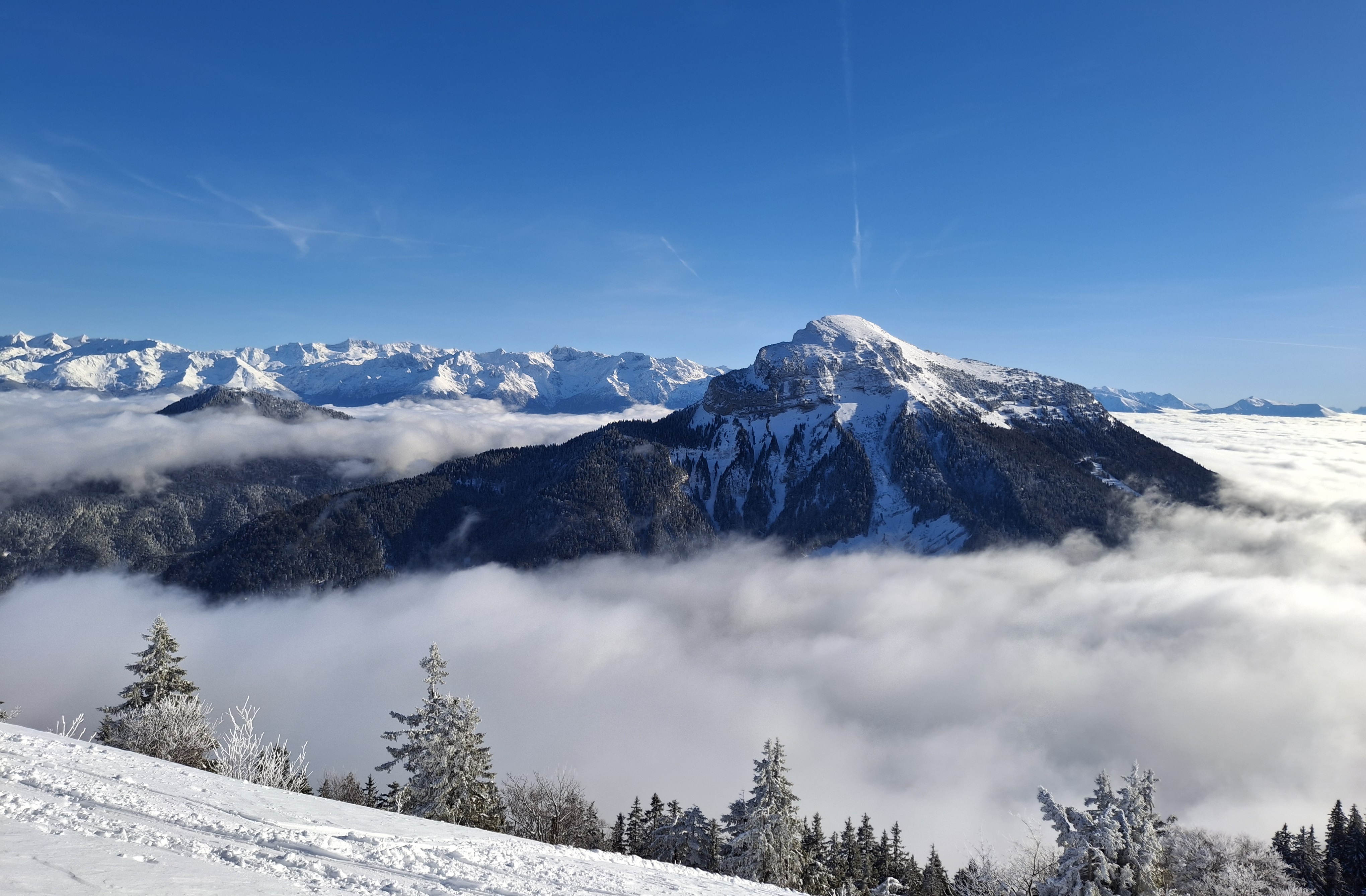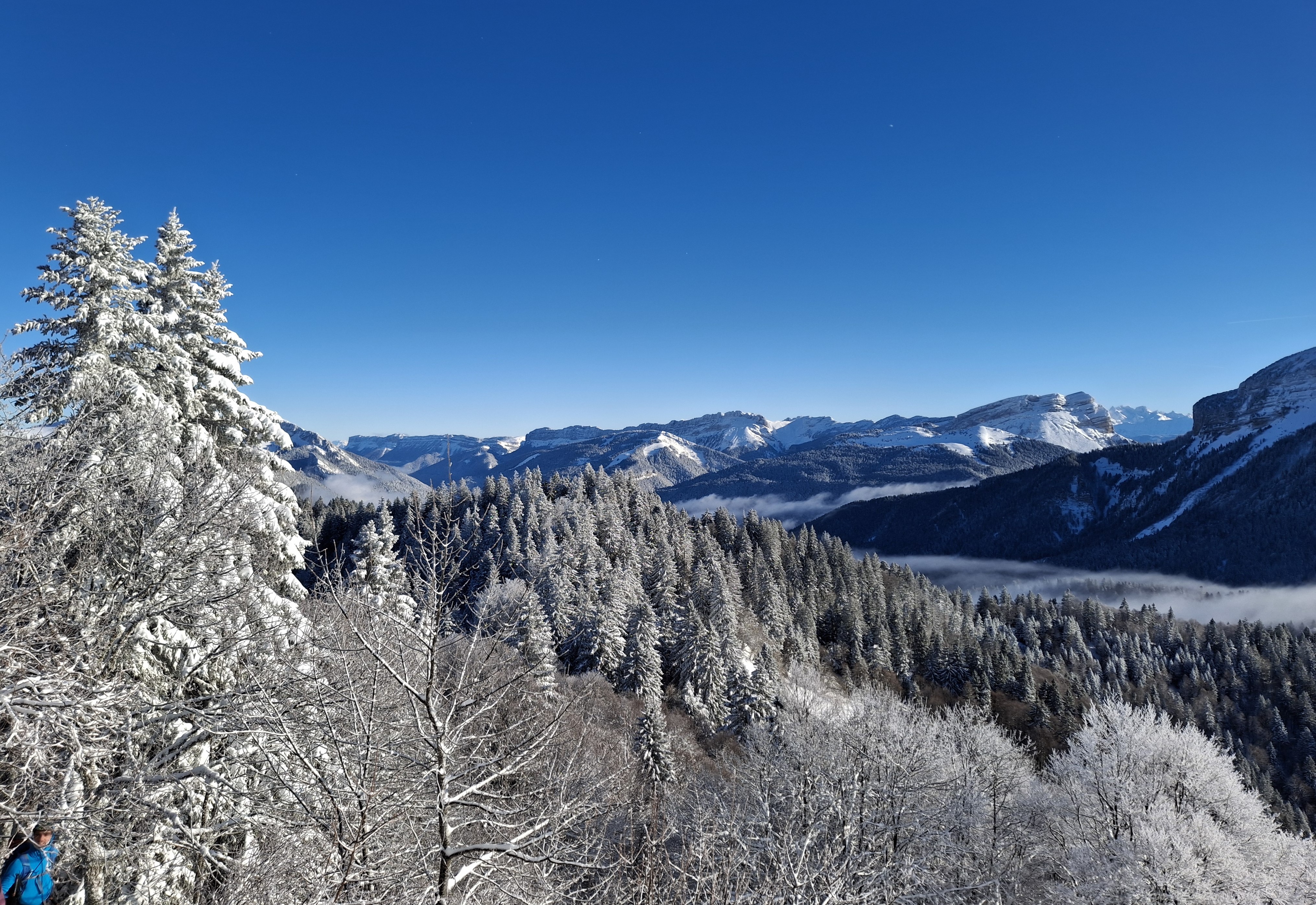 ❄️Avec un beau temps idéal, le dimanche, c'est journée poudre. L'itinéraire avait été étudié pour arpenter des coins sauvages en forêt et trouver de la poudre immaculée. Et cela, malgré la ribambelle de locaux qui profitent de cet arrosage de neige toute fraîche au Charmant Som. Après avoir atteint une première vue magnifique au pied de la Pinéa, nous replongeons en forêt pour skier dans ce doux manteau cotonneux et slalomer entre les arbres. Les peaux sont ressorties pour grimper sur la crête du Mont Fromage. Après une pause pique-nique éponyme, nous rejoignons l'itinéraire plus classique du Charmant Som. Le catalogue d'activités dominicales est fourni : raquettes, ski de rando, ski de fond, trail...