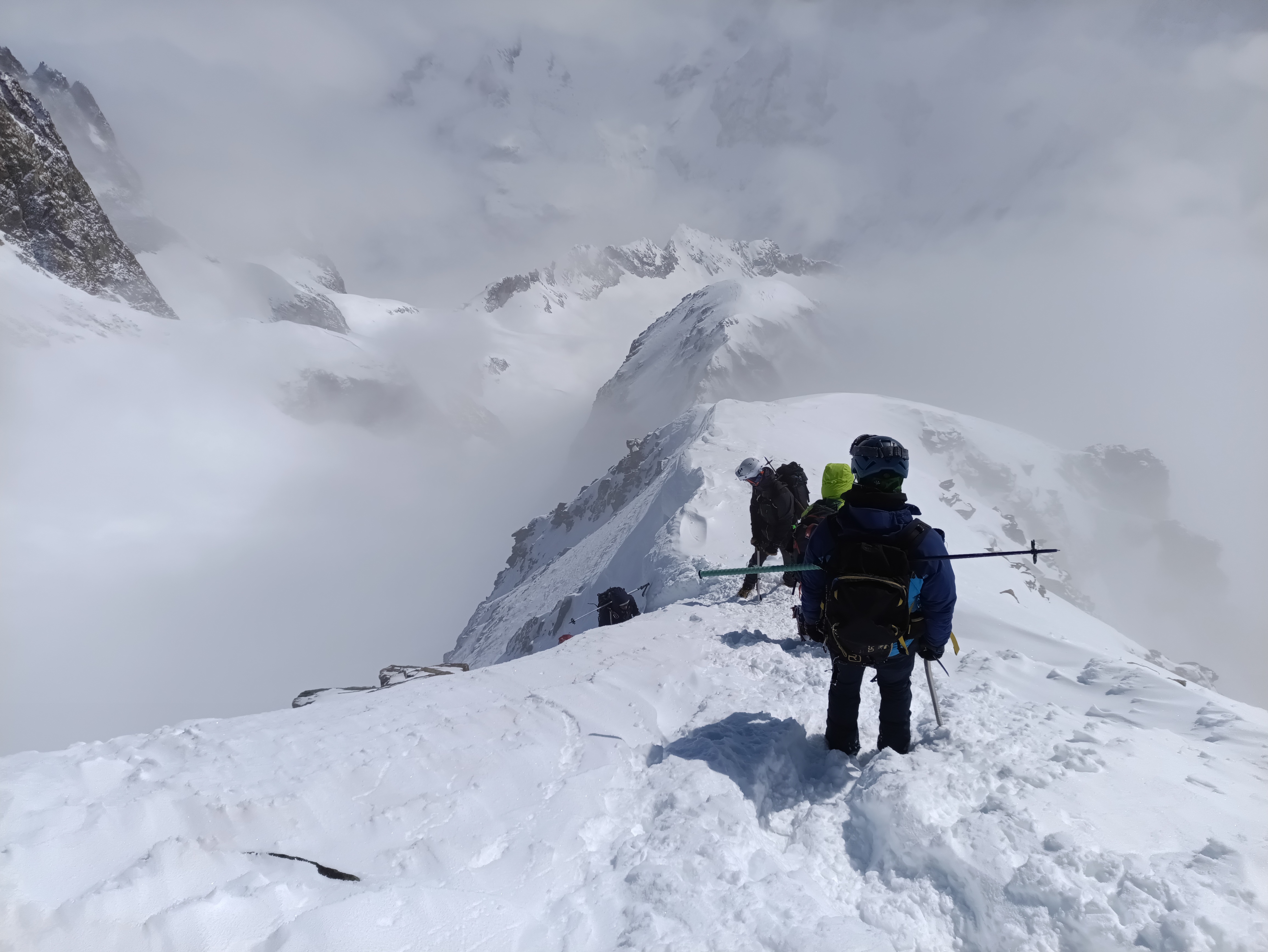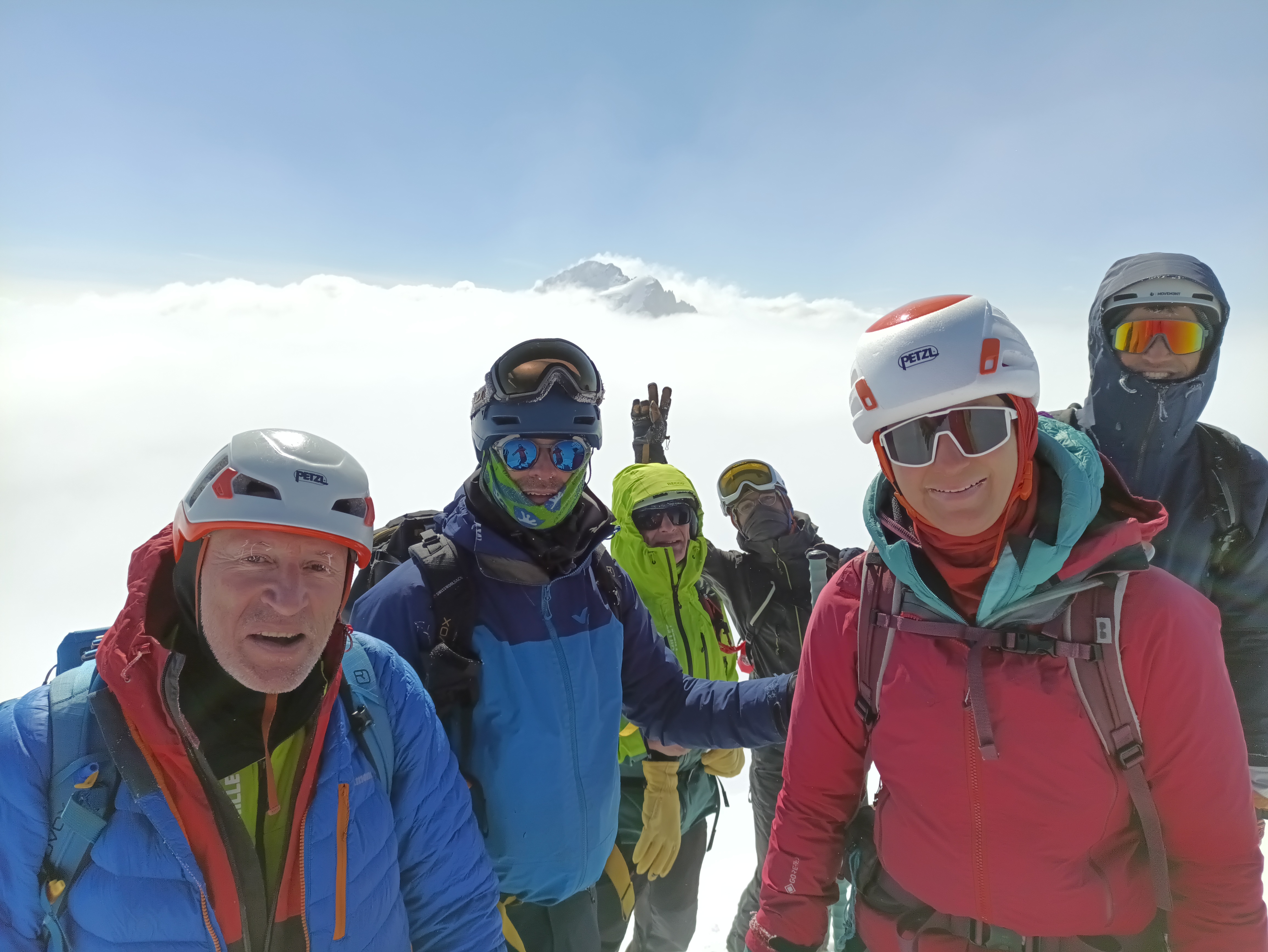Puis vient le sommet de notre aventure : la Grande Ruine, pointe Brevoort, 3 765 mètres. Un couloir raide, exigeant, où chaque mouvement compte. L’air se fait plus rare, les gestes plus précis. Et soudain, la délivrance. Là-haut, suspendus au-dessus d’une mer de nuages, nous faisons face à la Barre des Écrins. Le temps semble s’arrêter.