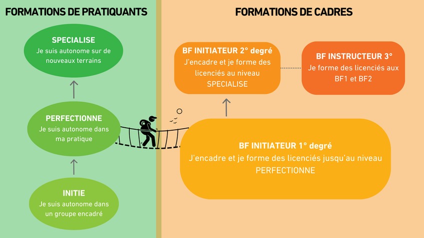 - Une formation des cadres qui permet de devenir Initiateur puis de passer des qualifications de plus en plus poussées (Moniteur, Instructeur).