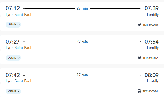 Aller : TER Lyon Saint-Paul <> Lentilly de 07:27 - RDV 10 minutes avant le départ sur le quai de la gare.